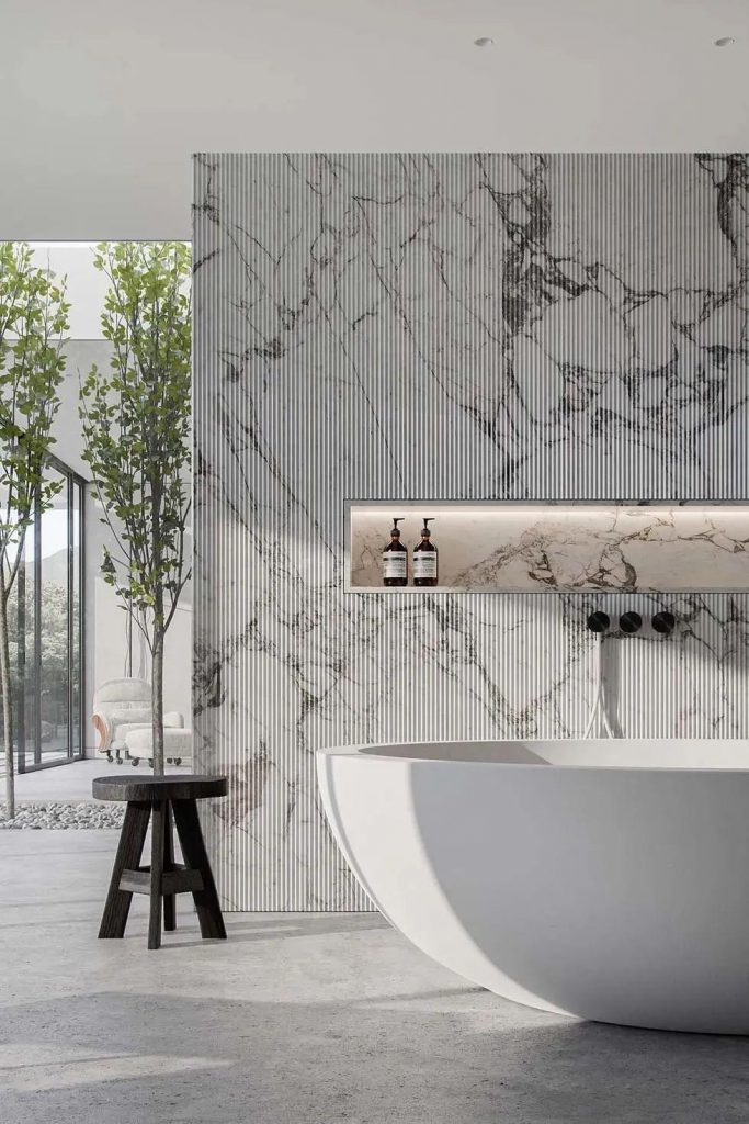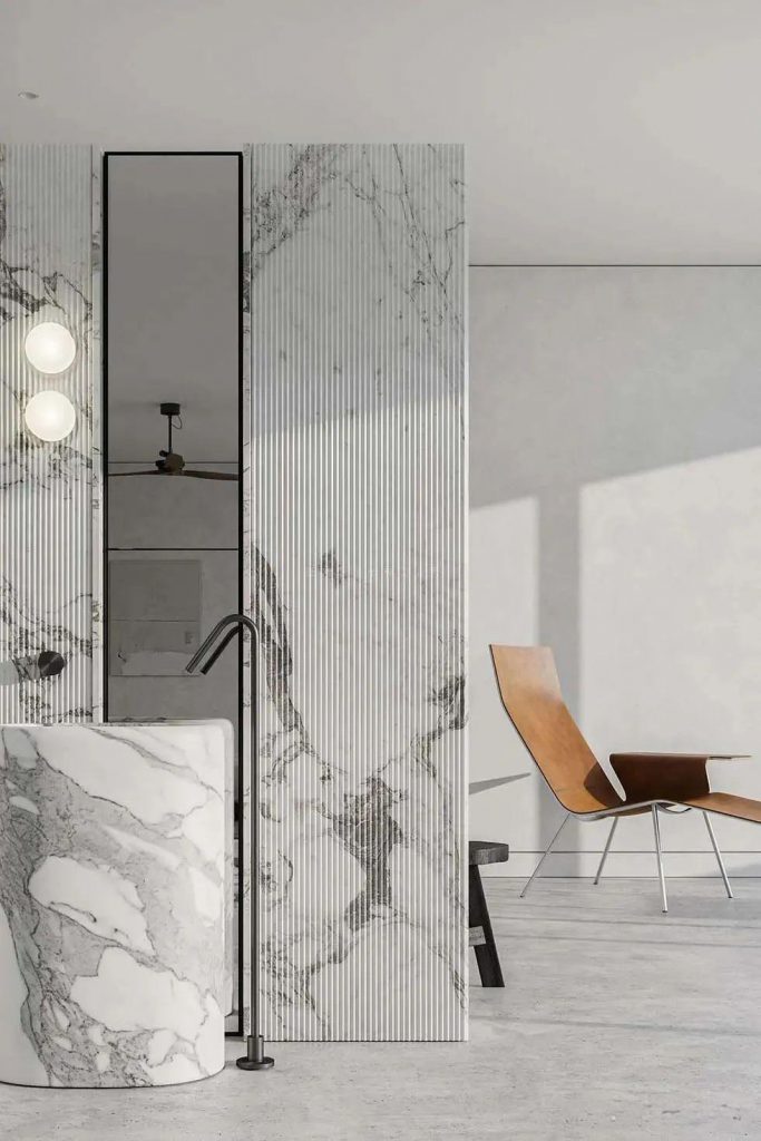 При использовании мрамора с поверхностью естественного скола также следует учитывать взаимосвязь между весом, толщиной, размером камня и технологией монтажа. Он подходит для пространств в натуральном, грубом стиле.