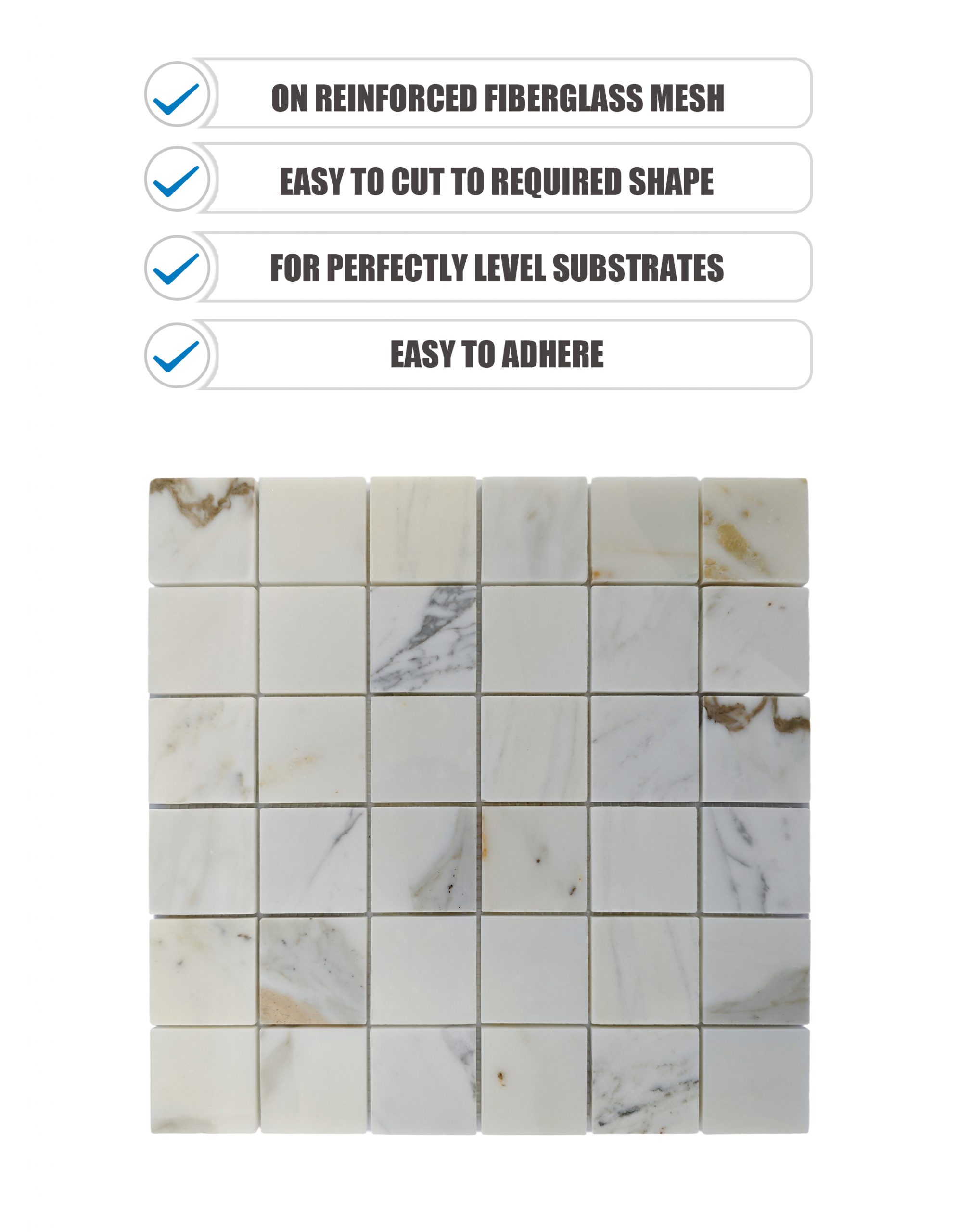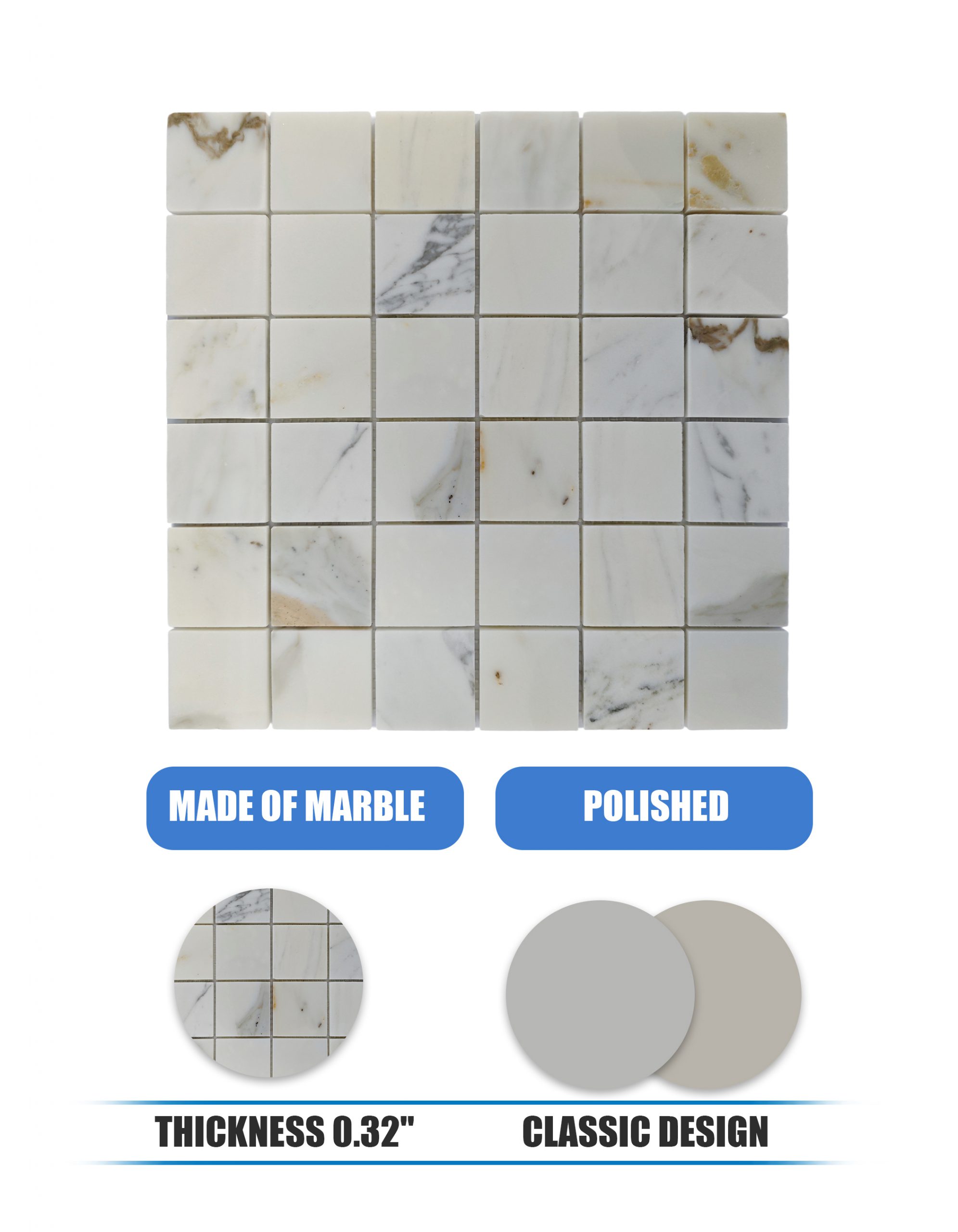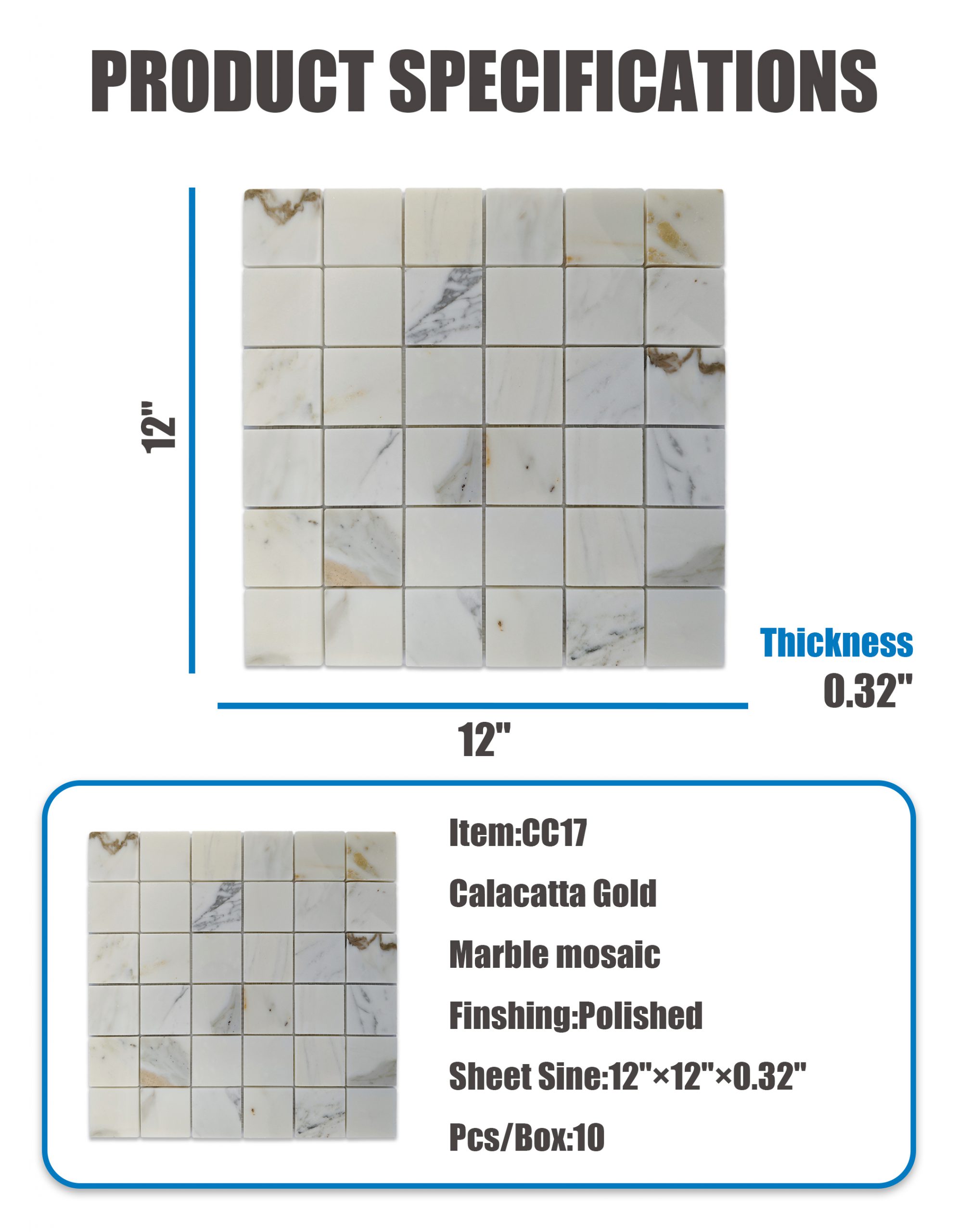 Изделие CC17 — это полированная мраморная мозаика, изготовленная из премиального мрамора Calacatta Gold, известного своим ярким белым фоном и мягкими струящимися прожилками золотисто-серого оттенка. Выполненная в чистом квадратном сетчатом узоре, эта мозаика обеспечивает вид утонченной элегантности, подходящий как для классических, так и для современных интерьеров. Предварительно собранная на прочных сетчатых листах, она гарантирует простую укладку и бесшовную отделку высокого класса.