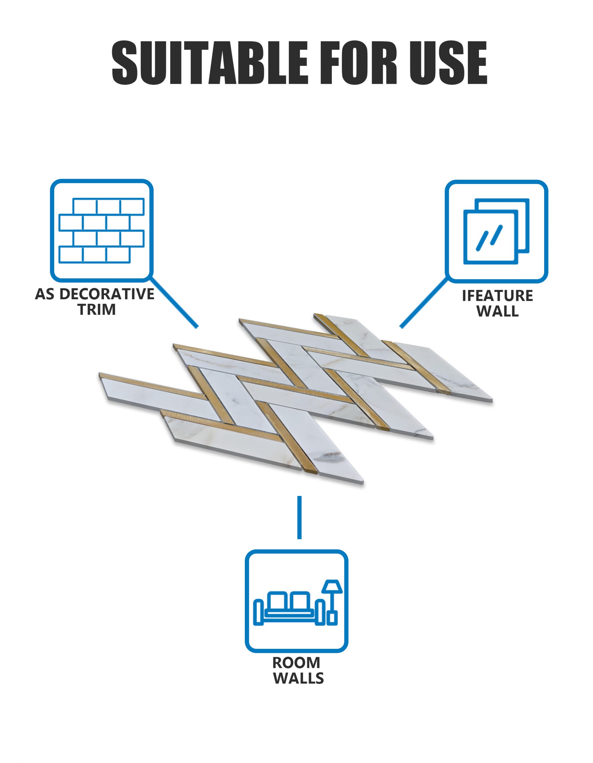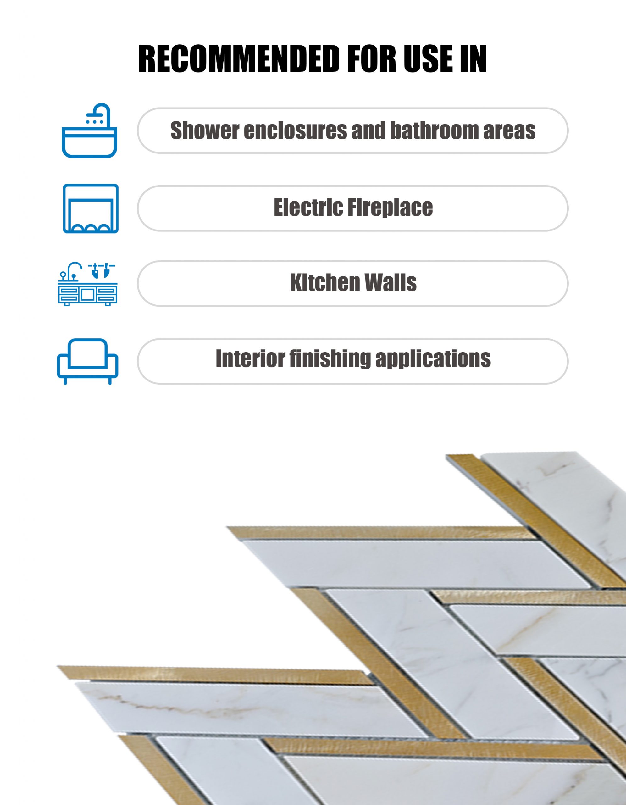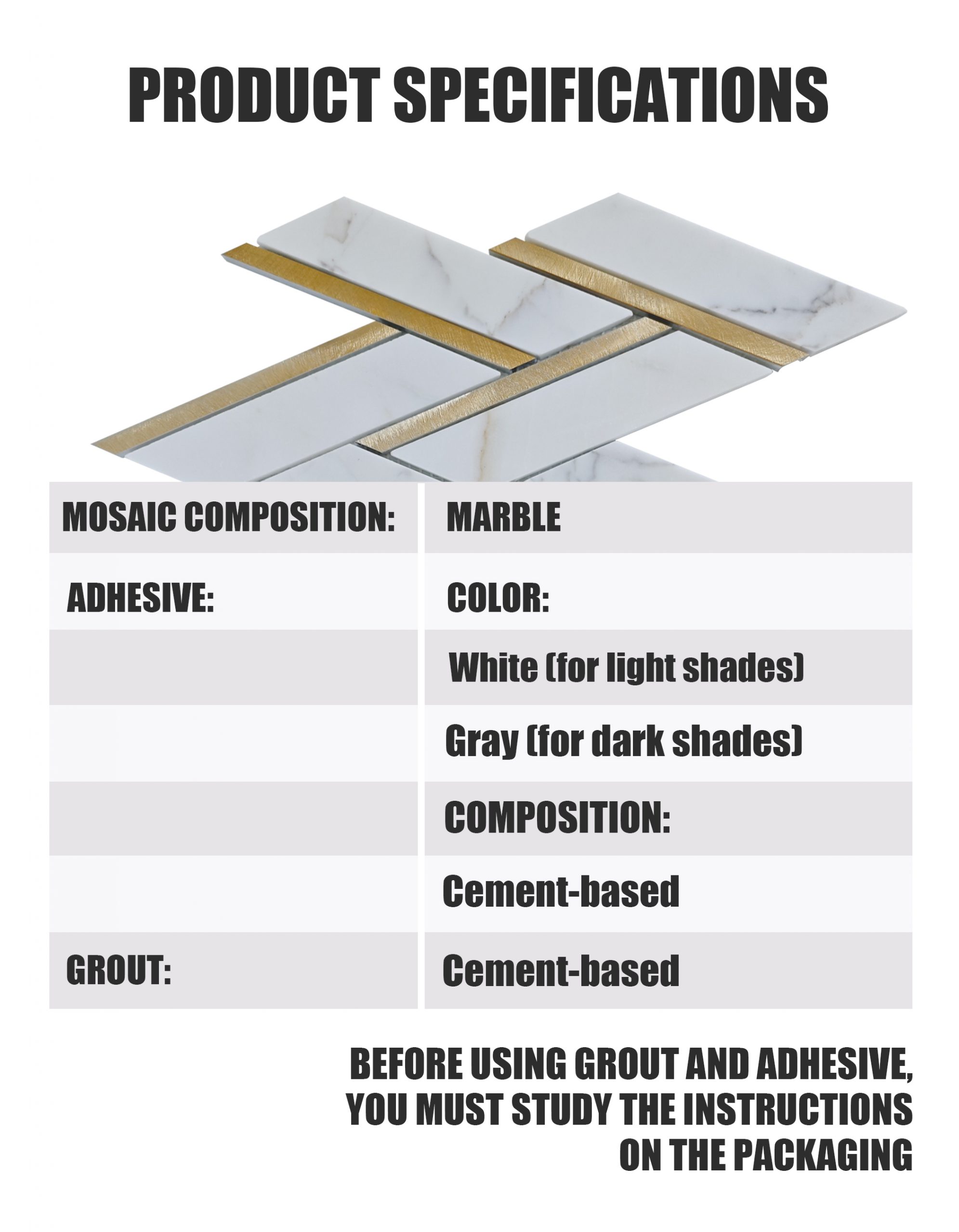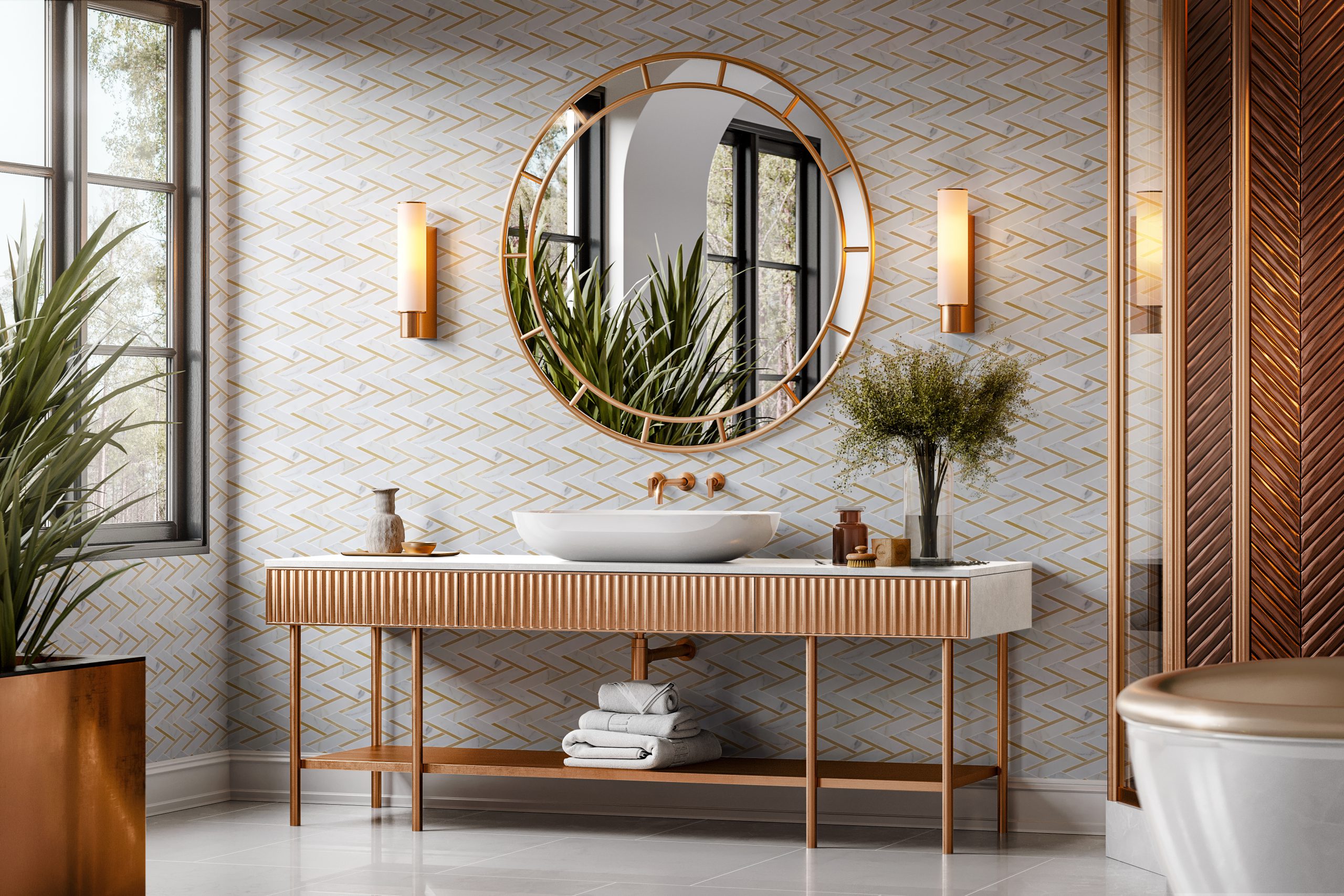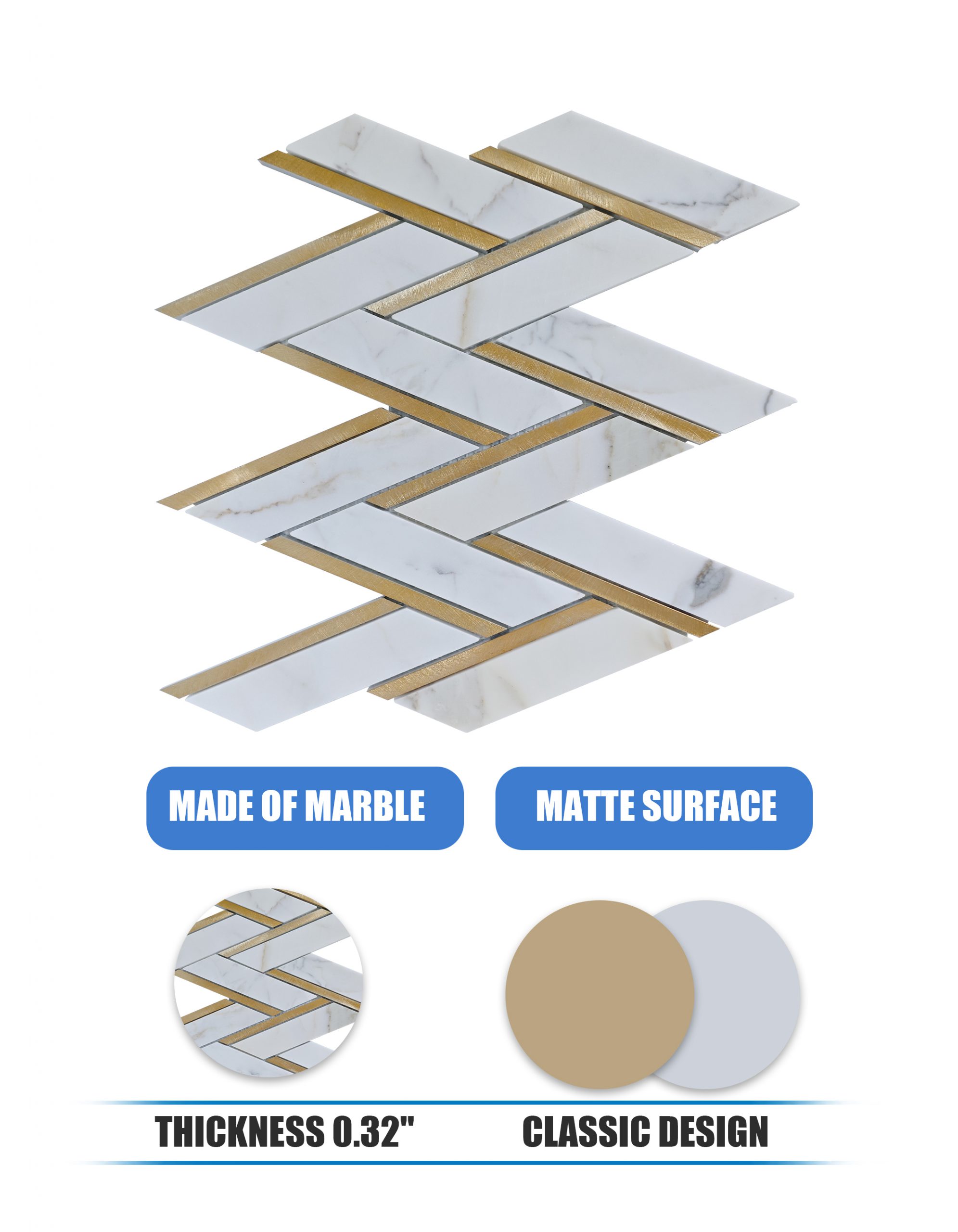 Мозаика AR3 переопределяет понятие роскоши, сочетая классический белый мрамор Calacatta с современными золотистыми металлическими полосами в timeless узоре «ёлочка». Полированная отделка подчеркивает нежную серую прожилку мрамора и отражает свет от металлических вставок, создавая одновременно богатую и визуально динамичную поверхность. Это идеальное решение для привнесения нотки современного гламура в кухни, ванные комнаты и акцентные стены.