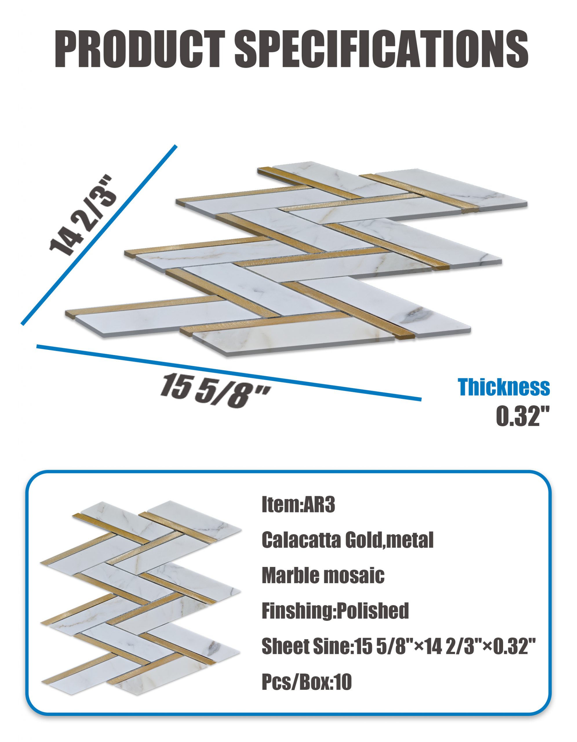 AR3​ — это мраморная мозаика Calacatta Gold, сочетающая роскошный белый мрамор Calacatta с блестящими золотистыми металлическими полосами в утонченном узоре «ёлочка» и полированной отделкой. Размер каждого листа составляет 15⅝» × 14⅔» × 0,32″ (приблизительно 39.7 × 37.2 × 0.8 см), в коробке 10 листов. Продукт предлагает простую в укладке выразительную поверхность для фартуков, акцентных стен и декоративных зон.