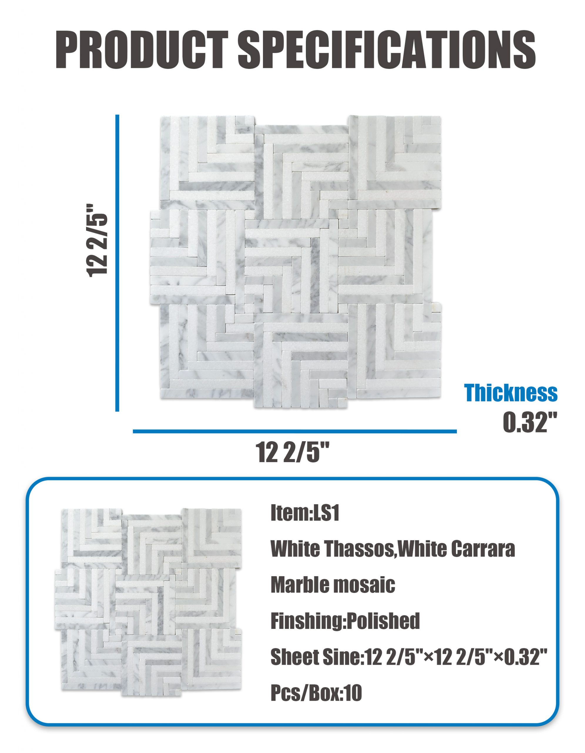 LS1​ — это полированная мраморная мозаика, которая элегантно сочетает белый мрамор Тасос (White Thassos) и белый мрамор Каррара (White Carrara) в сложном геометрическом узоре. Размер листа составляет 12⅖» × 12⅖» × 0,32″, в коробке 10 листов. Продукт предлагает яркую, готовую к укладке поверхность, идеально подходящую для кухонных фартуков, стен ванной комнаты и декоративных акцентов.