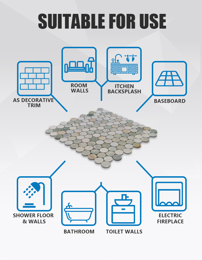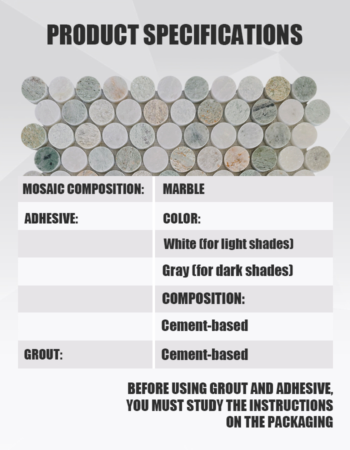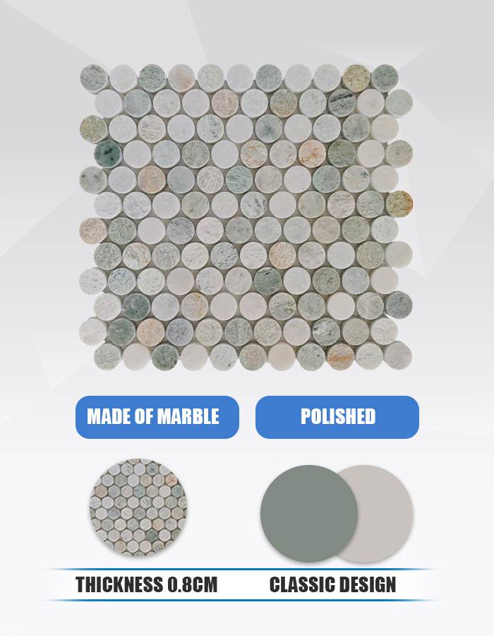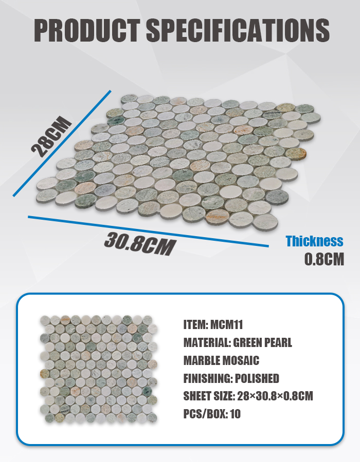 Изделие MCM11 представляет собой полированную мраморную мозаику, изготовленную из натурального мрамора «Зеленая жемчужина» (Green Pearl), характеризующегося успокаивающими зелеными и серо-белыми тонами, объединенными в целостный узор из круглых плиток. Каждый предварительно собранный лист предлагает гармоничное сочетание цвета и текстуры, что делает его идеальным выбором для привнесения органичной элегантности в жилые и коммерческие интерьеры .