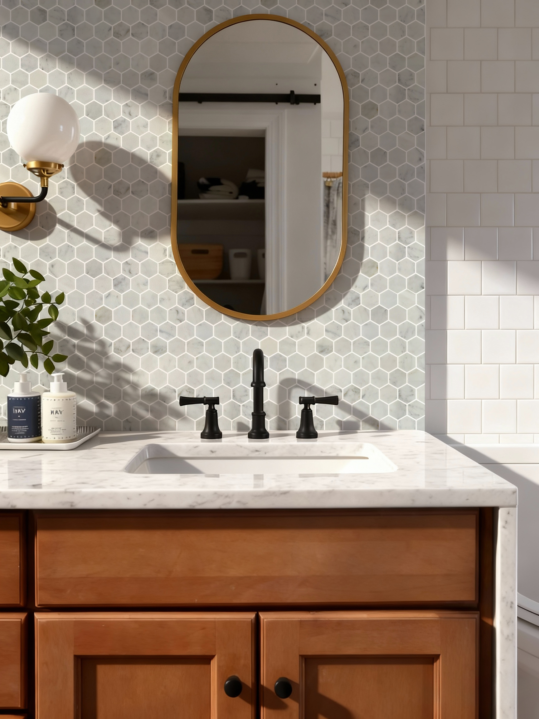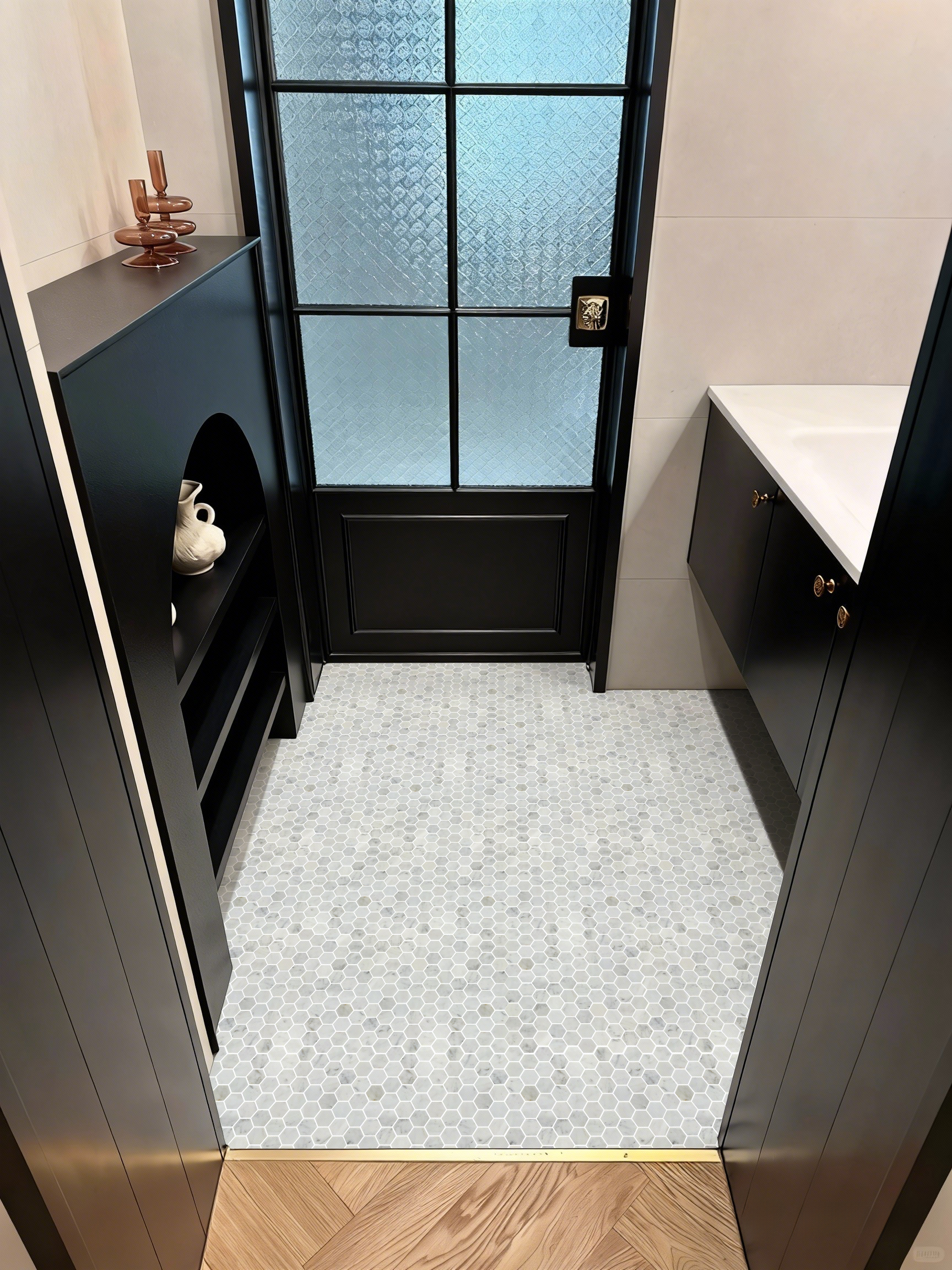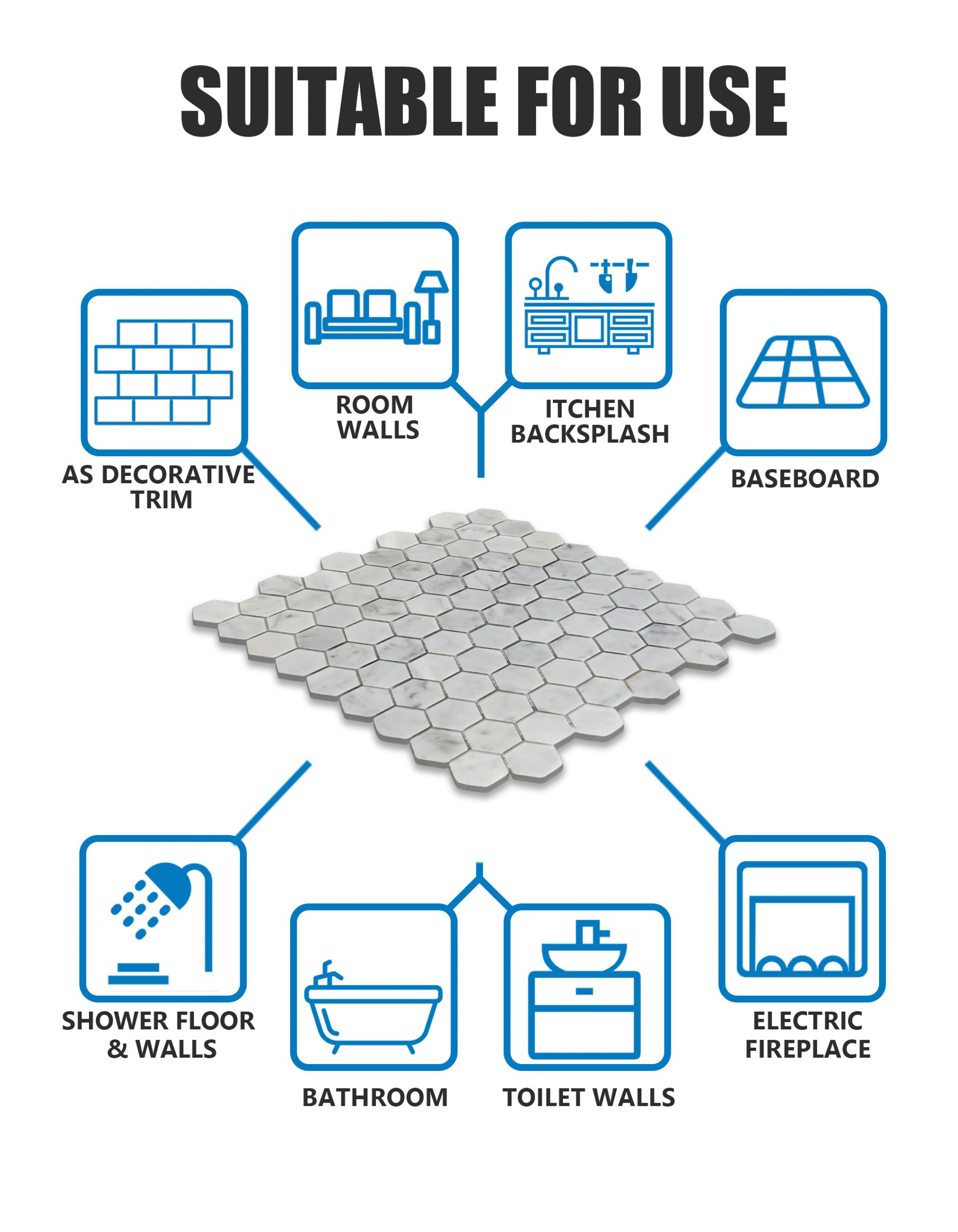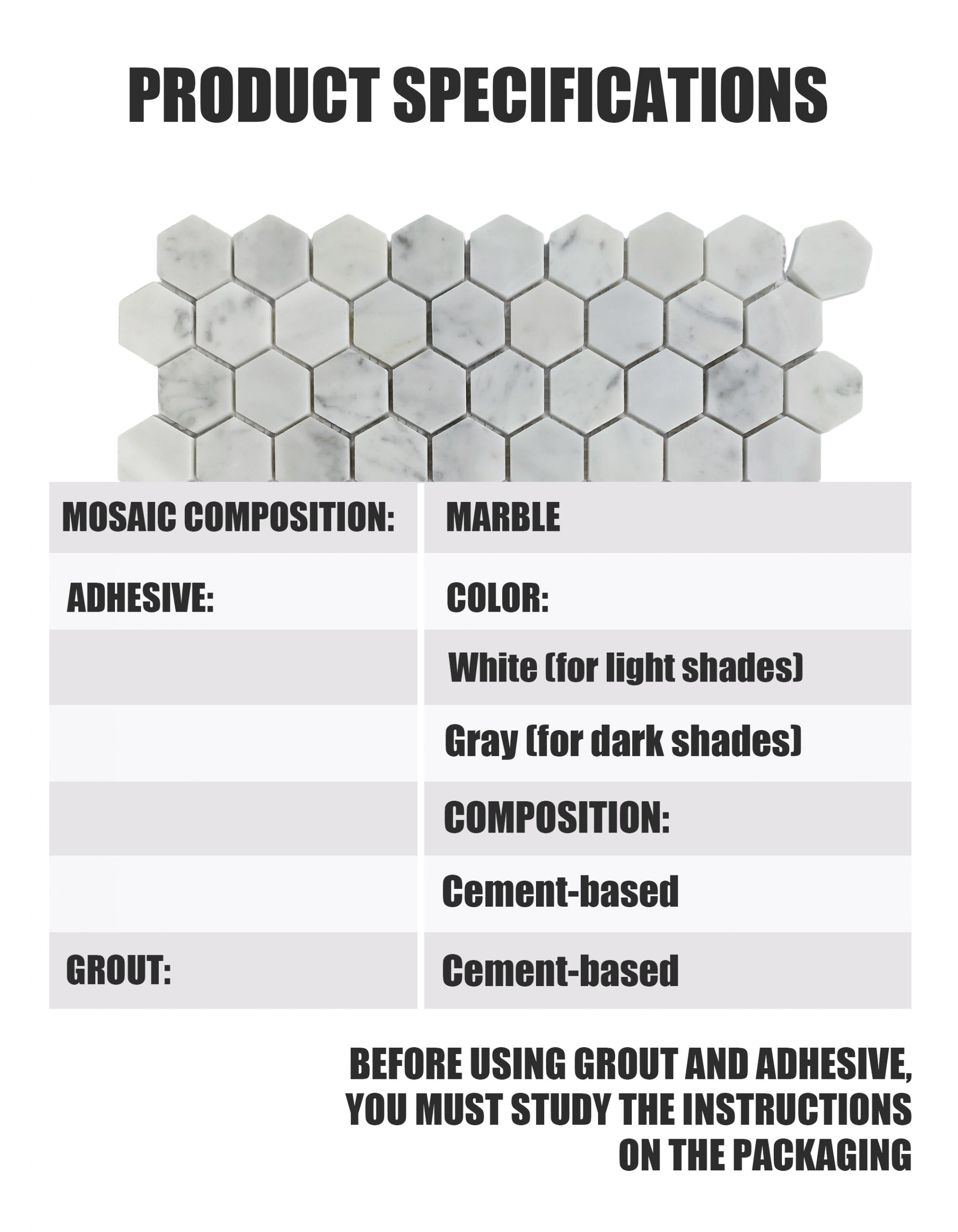 Шестигранная раскладка создает ритмичный, привлекающий внимание узор, который добавляет визуальный интерес, не перегружая пространство. Матовая отделка смягчает внешний вид мрамора, уменьшает блики и придает тактильное, современное ощущение, будучи при этом более устойчивой к отпечаткам пальцев и легким поверхностным следам. Светлый фон с нежными серыми прожилками привносит в любое помещение чистую, воздушную элегантность.