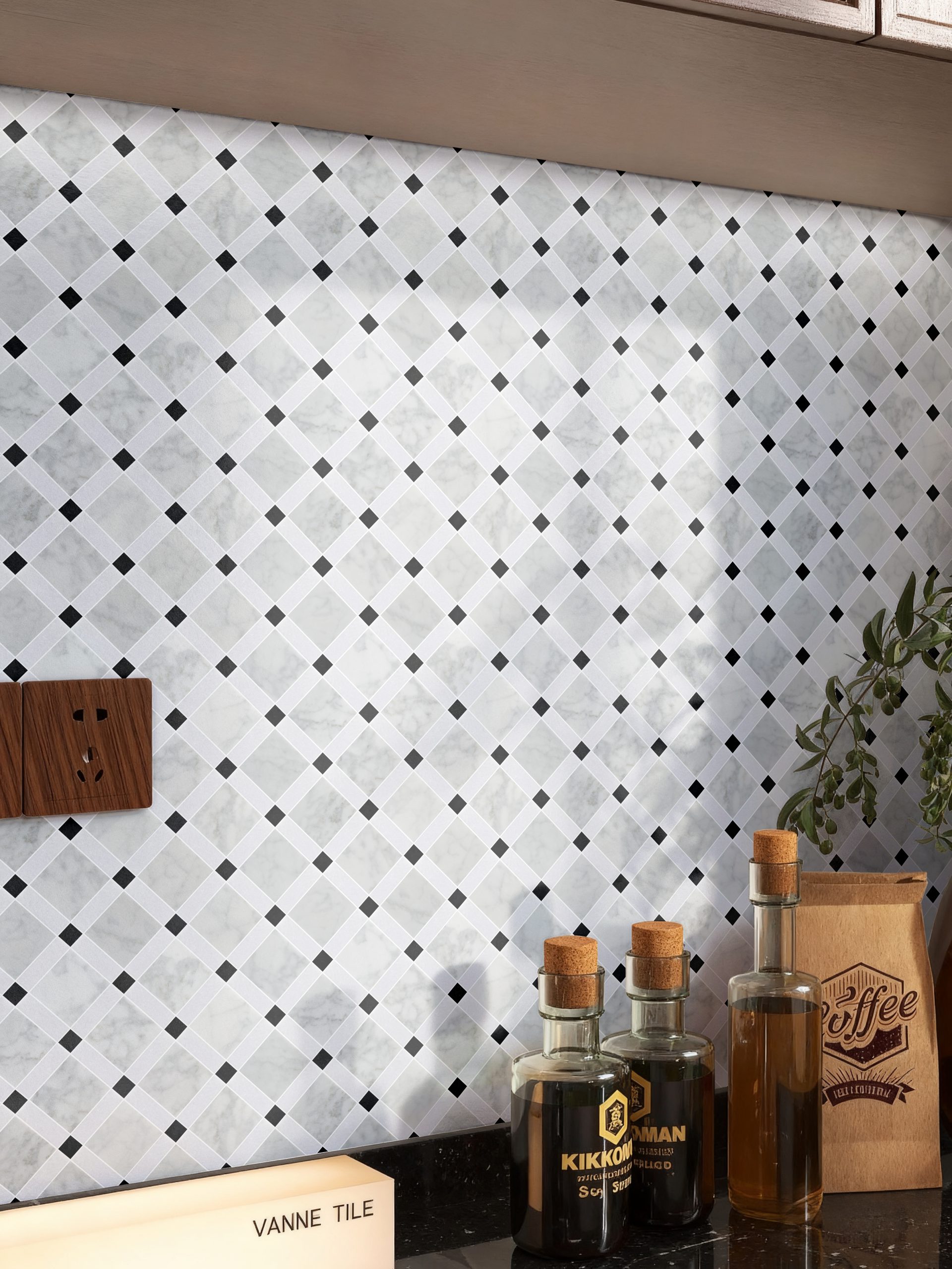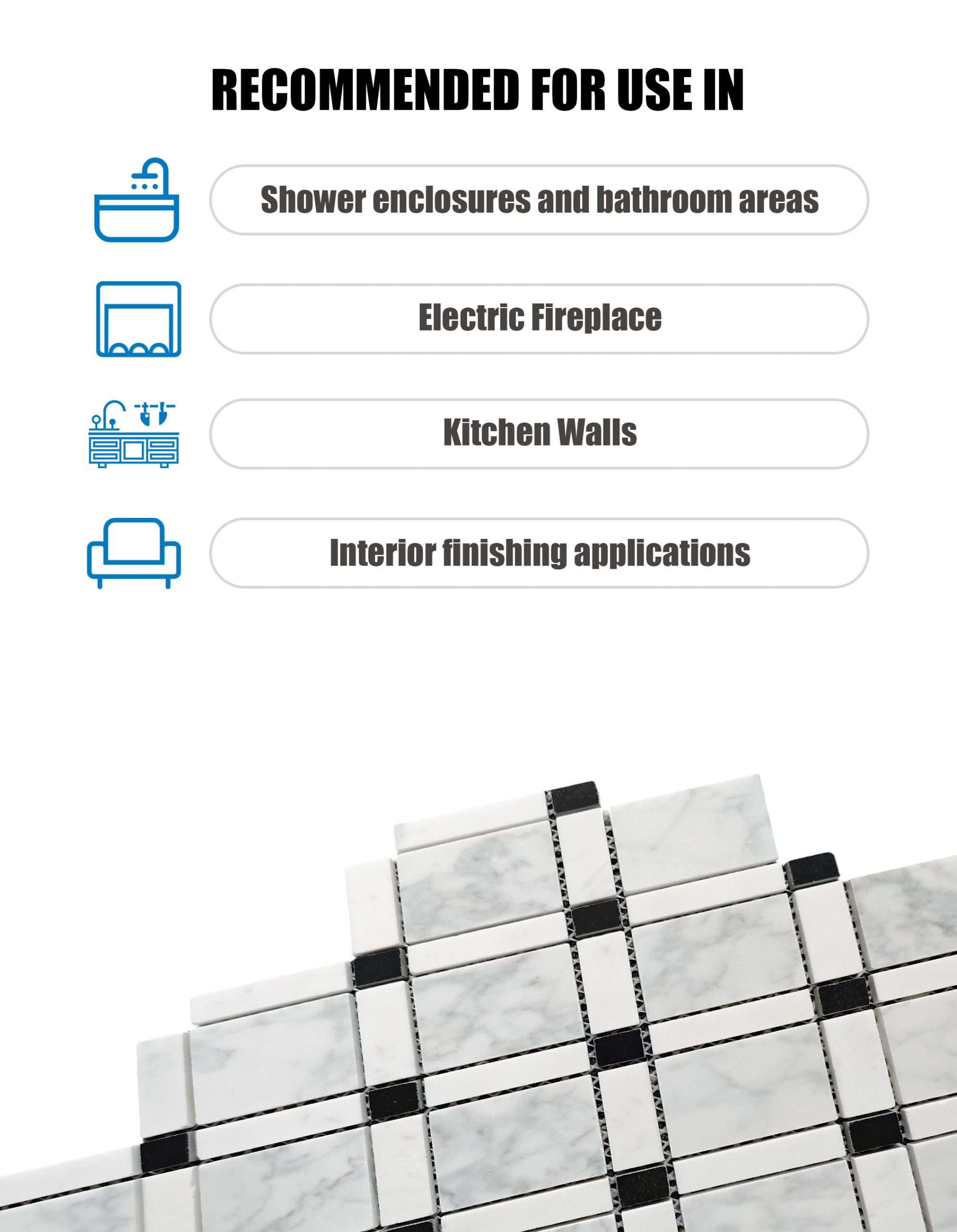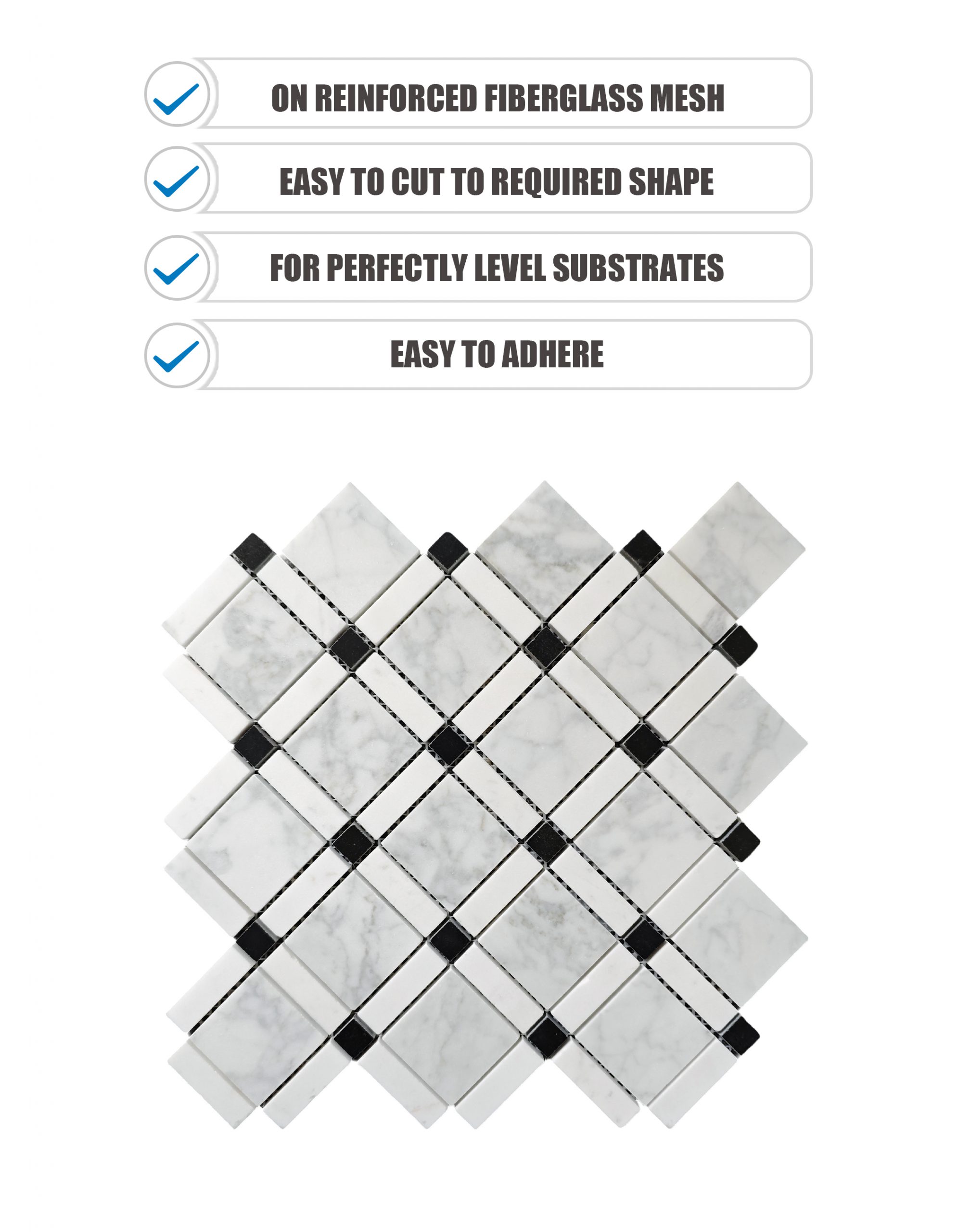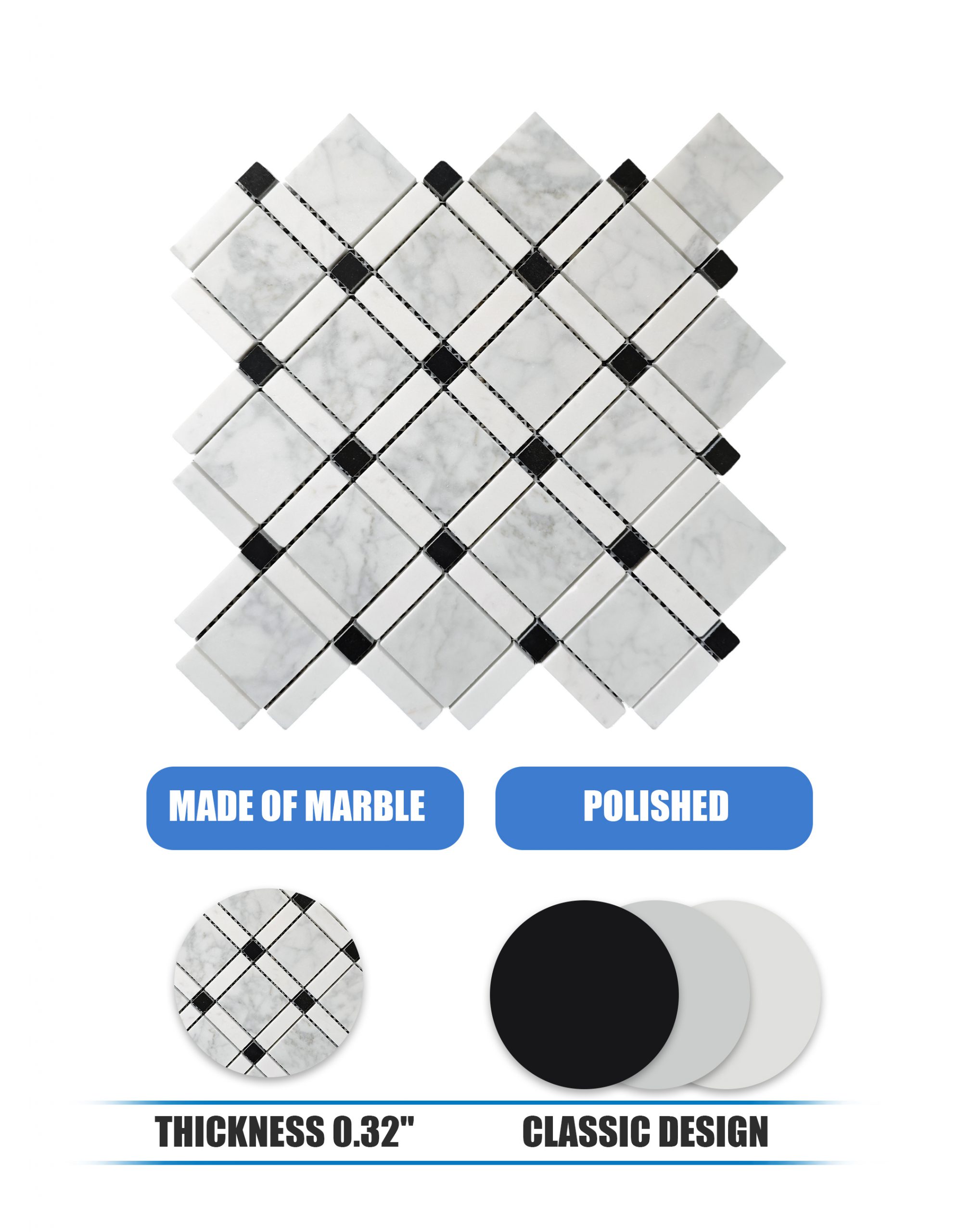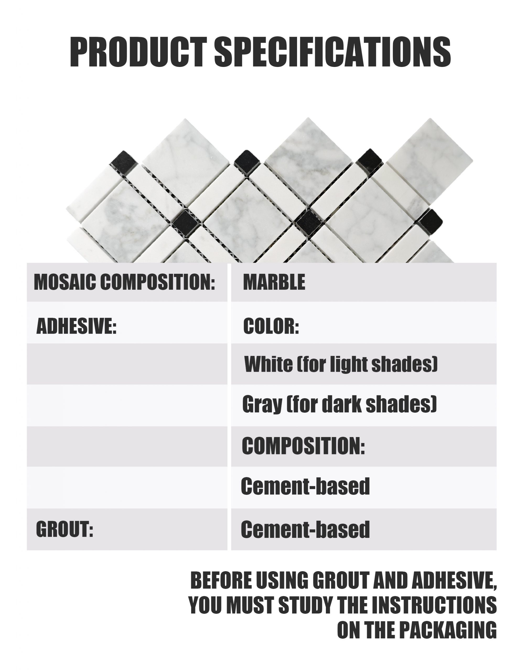 Каждая плитка точно вырезана из подлинного белого мрамора Каррара, Астон Уайт и Абсолют Блэк, что гарантирует постоянство цвета и долговечность. Мозаика предварительно собрана на сетчатой основе, обеспечивая выравнивание узора и простоту укладки. Полированная поверхность является гладкой, отражающей и легкой в уходе, подходящей для жилых и коммерческих помещений с небольшой нагрузкой .