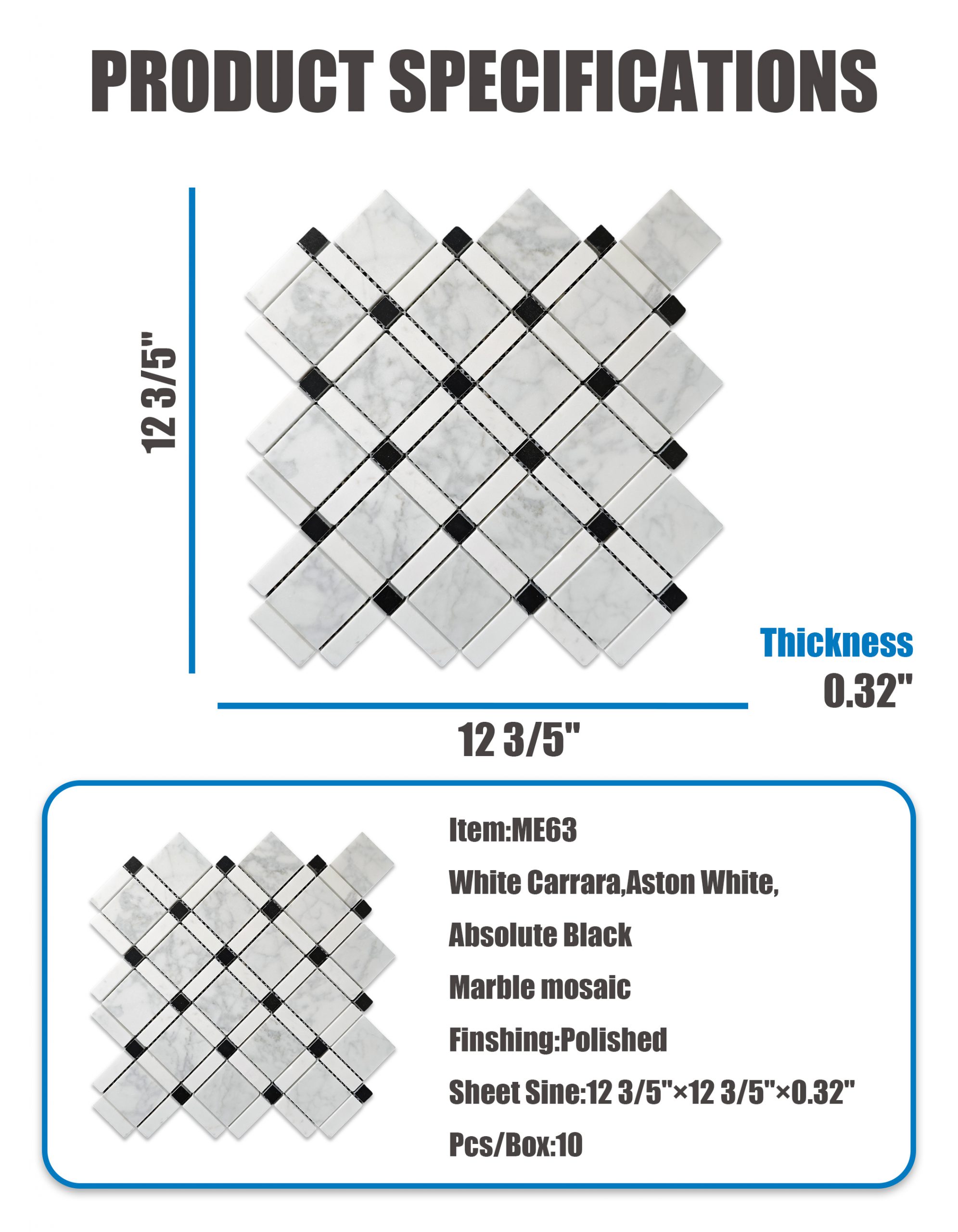 ME63​ — это полированная мраморная мозаичная плитка, которая сочетает белый мрамор Каррара (White Carrara), белый мрамор Астон (Aston White) и абсолютно черный мрамор (Absolute Black) в четком сетчатом узоре. Каждый лист имеет размер 12⅗» × 12⅗» × 0,32″, упаковка включает 10 листов в коробке. Продукт обеспечивает готовую к укладке классическую черно-белую поверхность для кухонь, ванных комнат и акцентных стен.