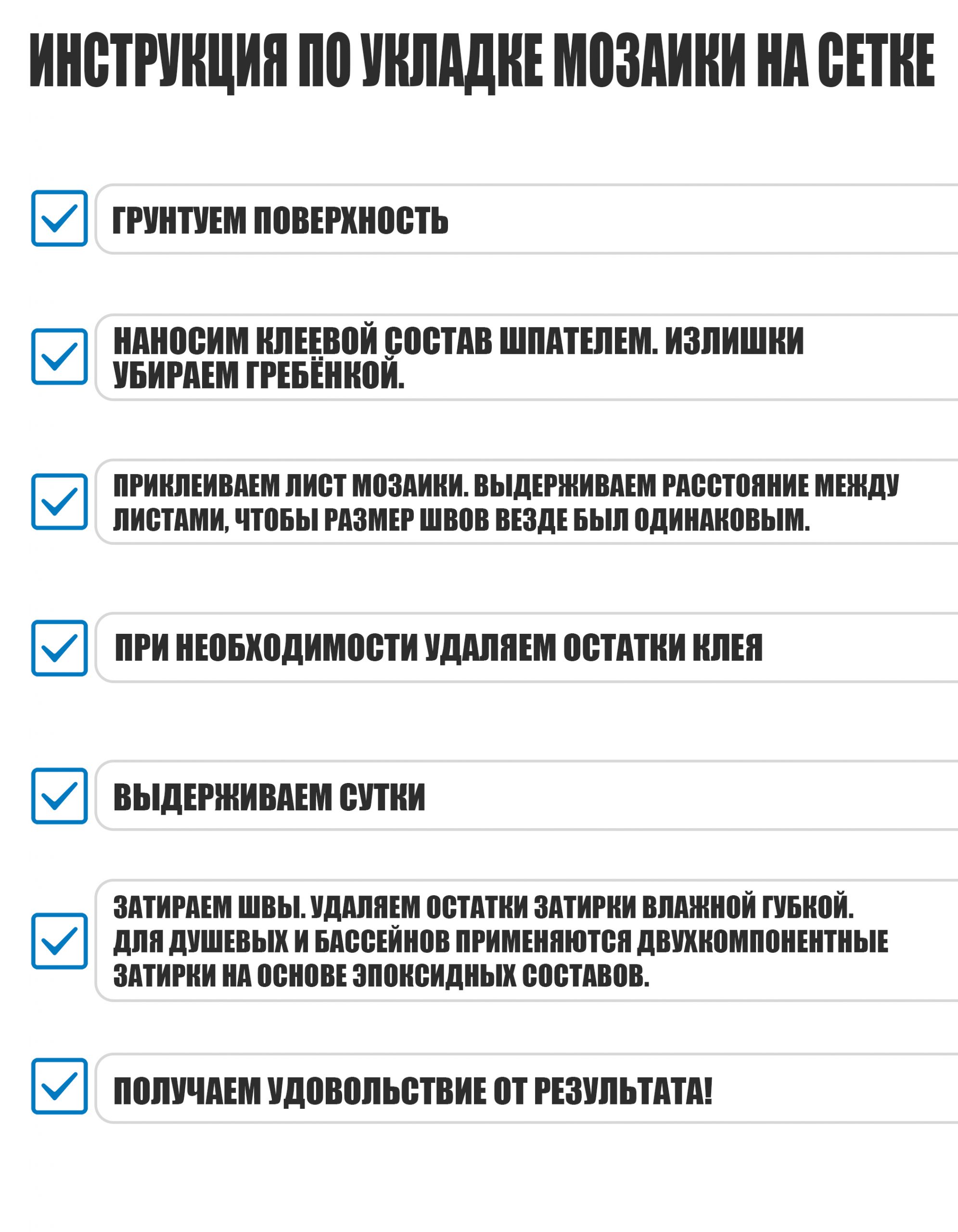 Предварительно собранные листы позволяют осуществить быструю укладку с непрерывным рисунком. Рекомендуется провести герметизацию мрамора после укладки для защиты от пятен и влаги. Ежедневная очистка мягкой влажной тканью поможет сохранить полированную поверхность и обеспечить долговечность красоты .