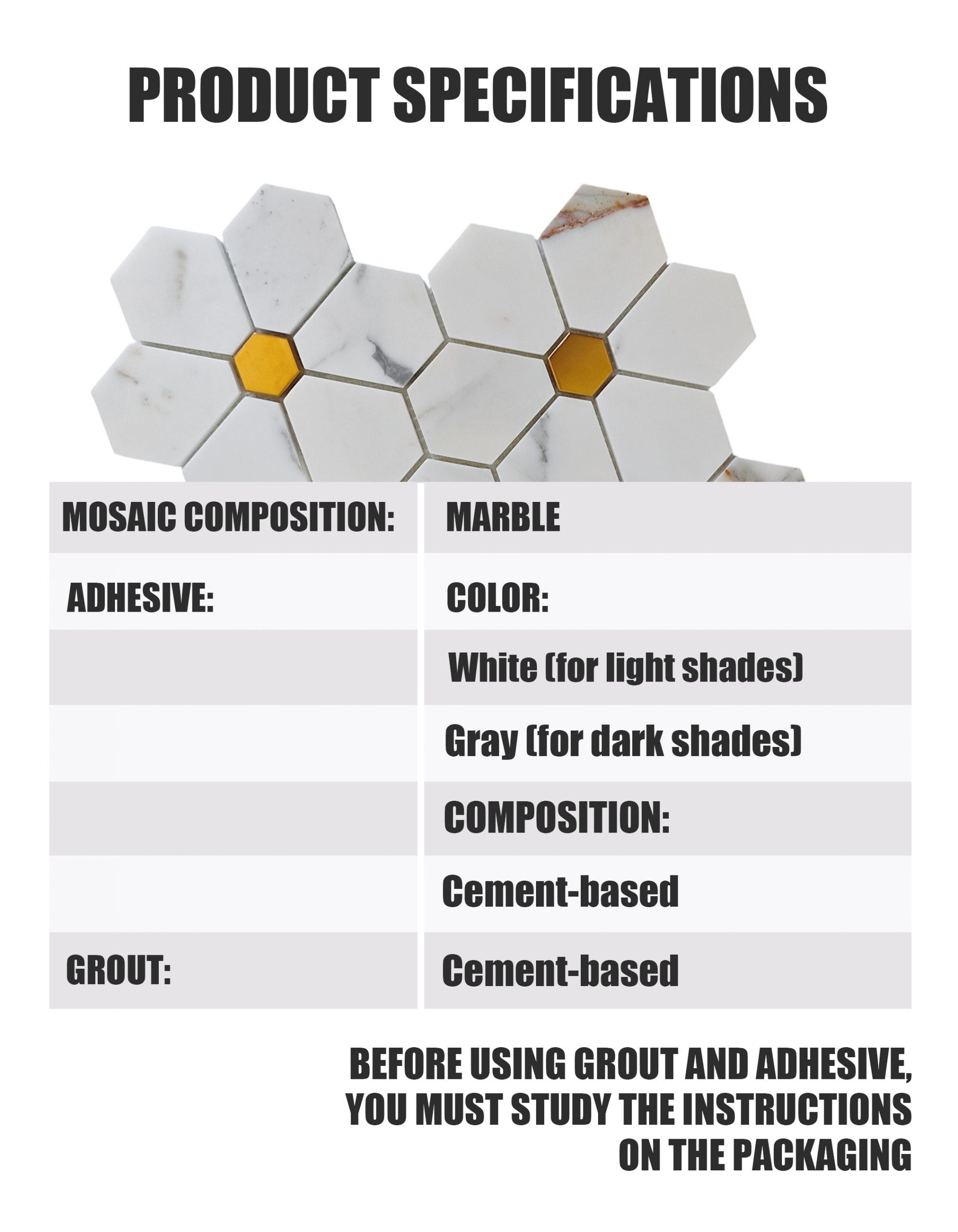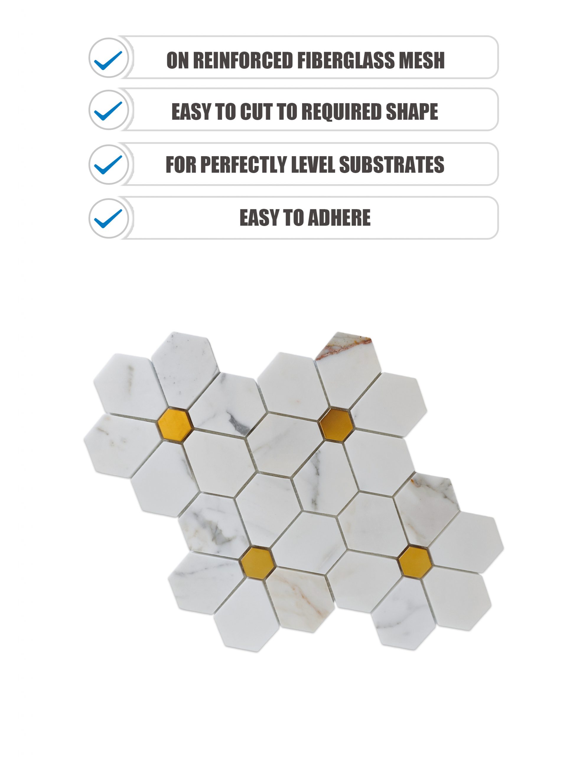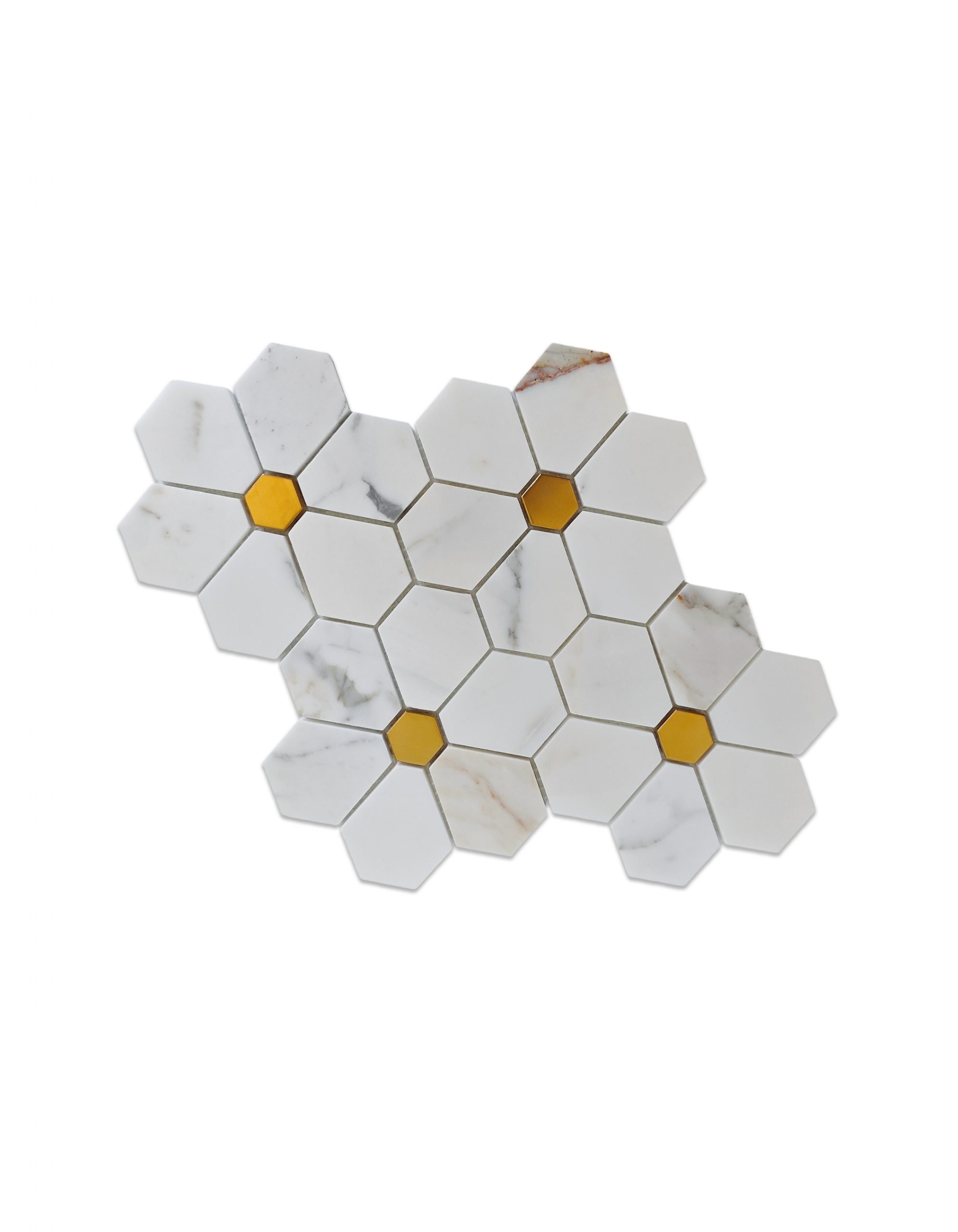 Каждая шестигранная плитка точно вырезана из подлинного мрамора Calacatta Gold, известного ярким белым фоном и нежными золотисто-серыми прожилками. Металлические вставки создают выразительный контраст, усиливая визуальную глубину мозаики. Предварительная сборка на сетчатой основе гарантирует целостность узора и простоту укладки .