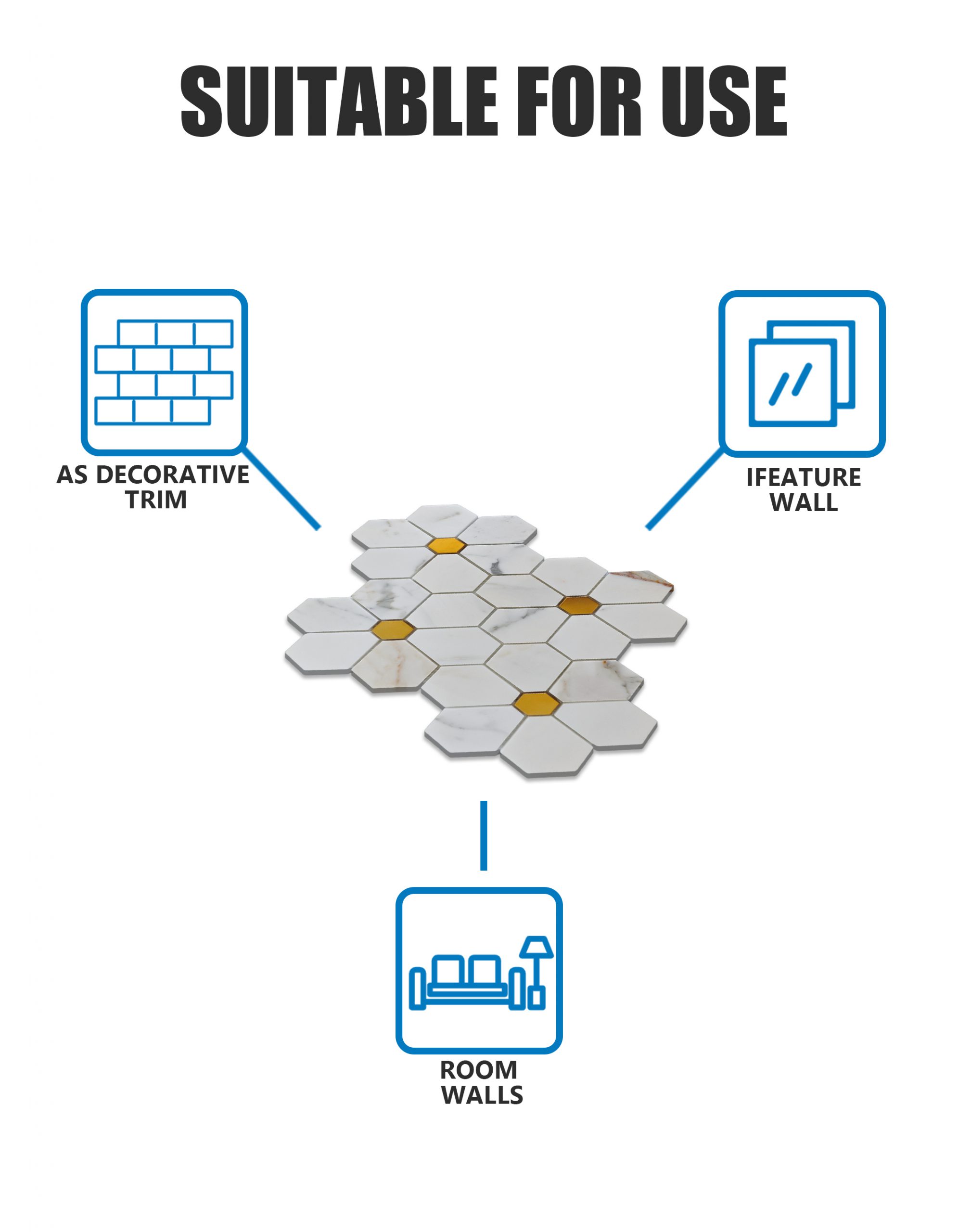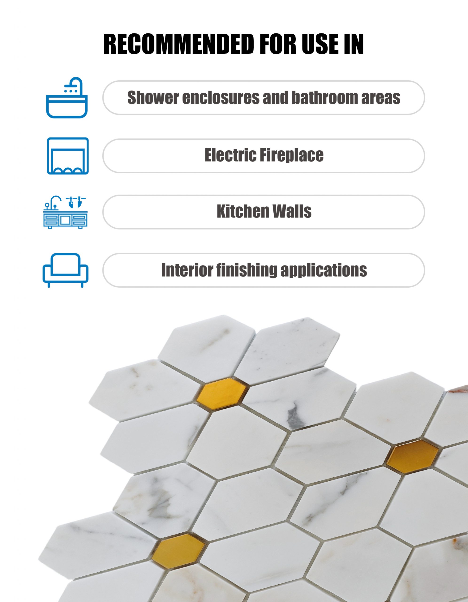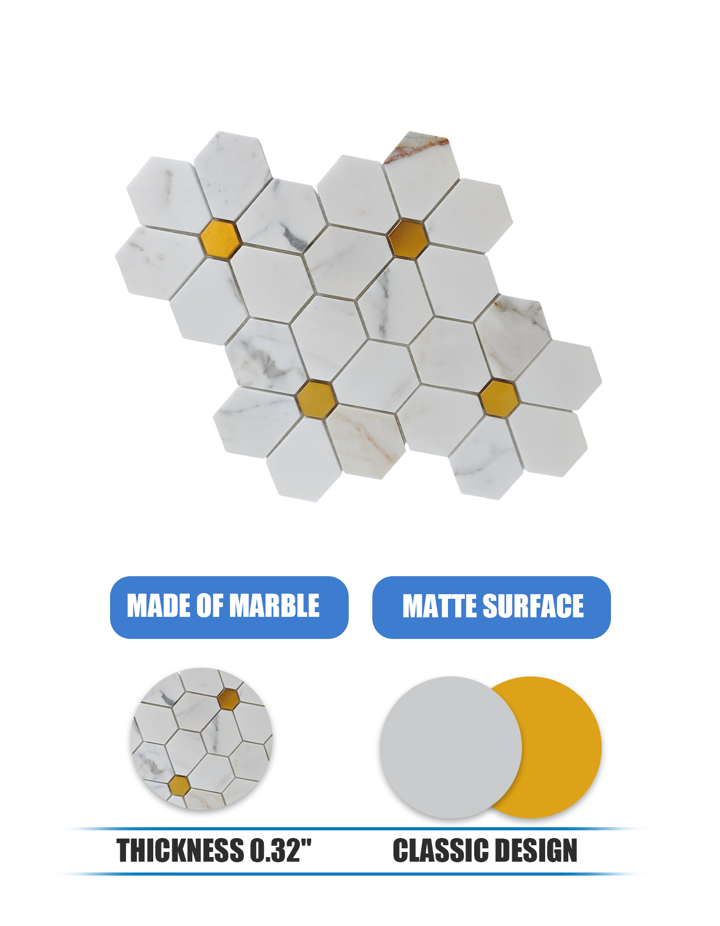 Каждая шестигранная плитка точно вырезана из подлинного мрамора Calacatta Gold, известного ярким белым фоном и нежными золотисто-серыми прожилками. Металлические вставки создают выразительный контраст, усиливая визуальную глубину мозаики. Предварительная сборка на сетчатой основе гарантирует целостность узора и простоту укладки .