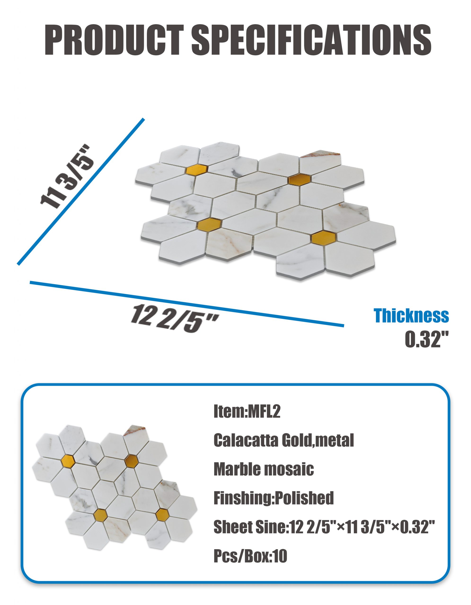Мозаика MFL2 представляет собой утонченную шестигранную мраморную композицию, сочетающую сияющую красоту мрамора Calacatta Gold с деликатными металлическими акцентами. Полированная отделка подчеркивает мягкие серо-золотистые прожилки мрамора, добавляя современный блеск, что создает поверхность, одновременно классическую и современную. Идеально подходит для преображения кухонь, ванных комнат и акцентных стен .