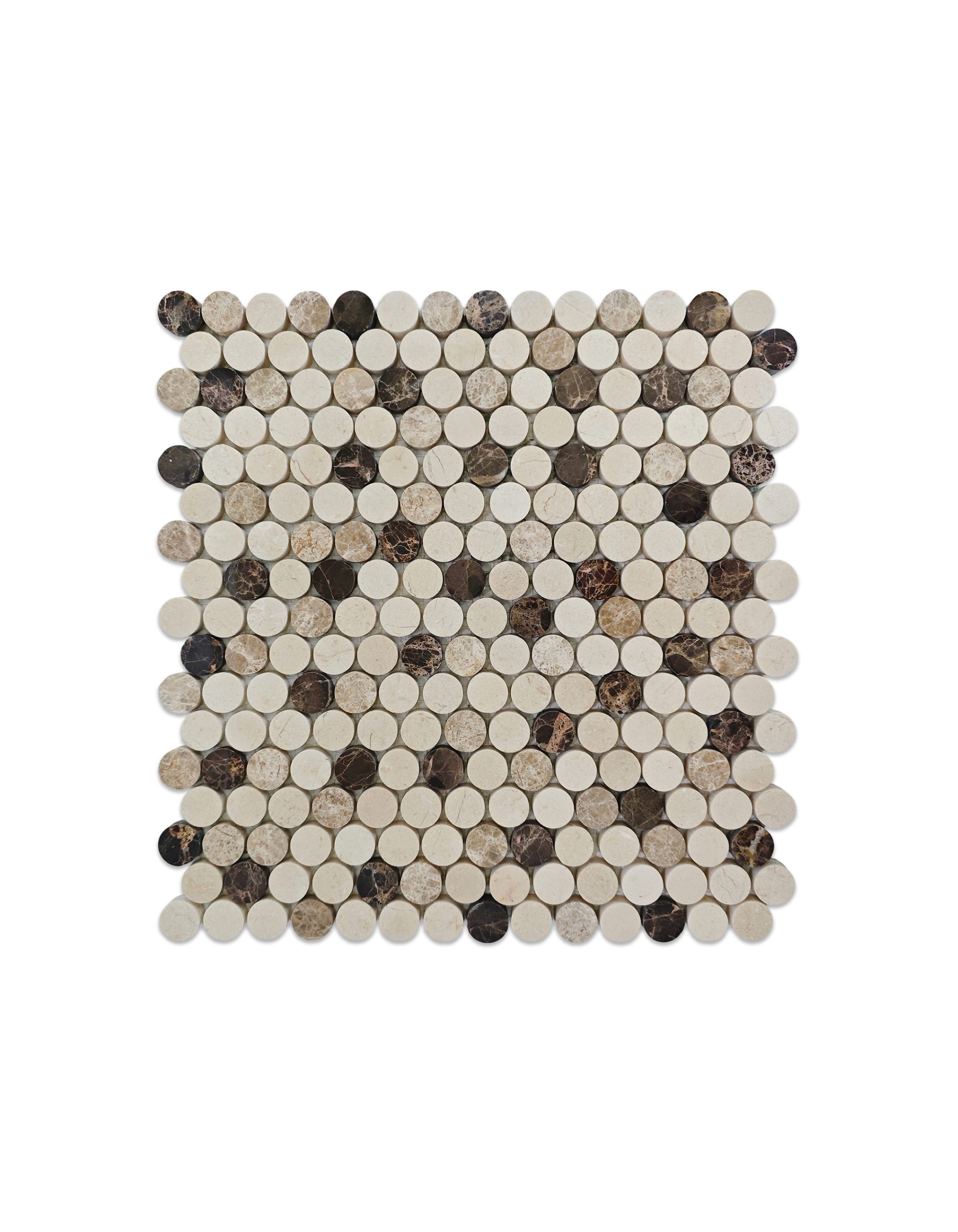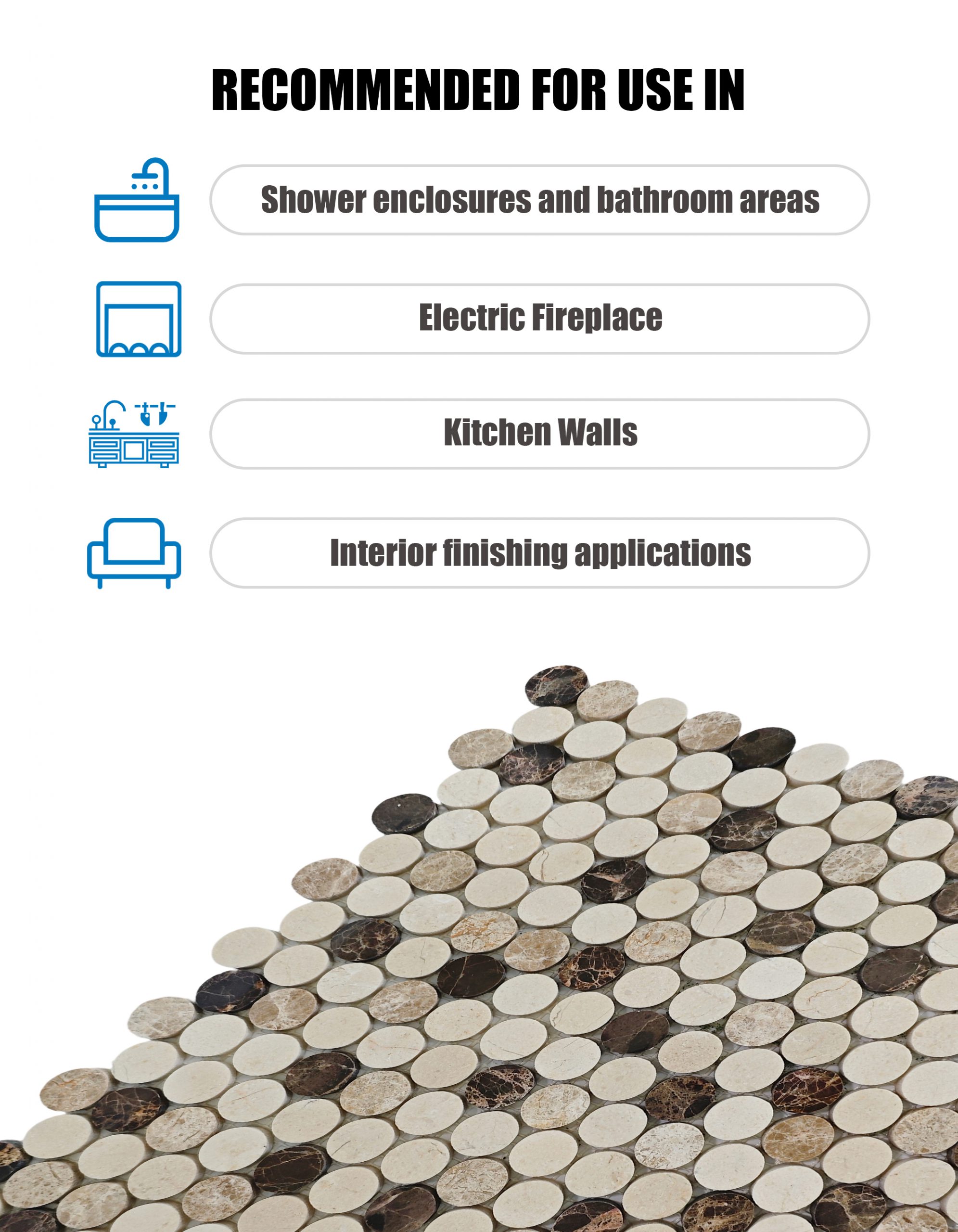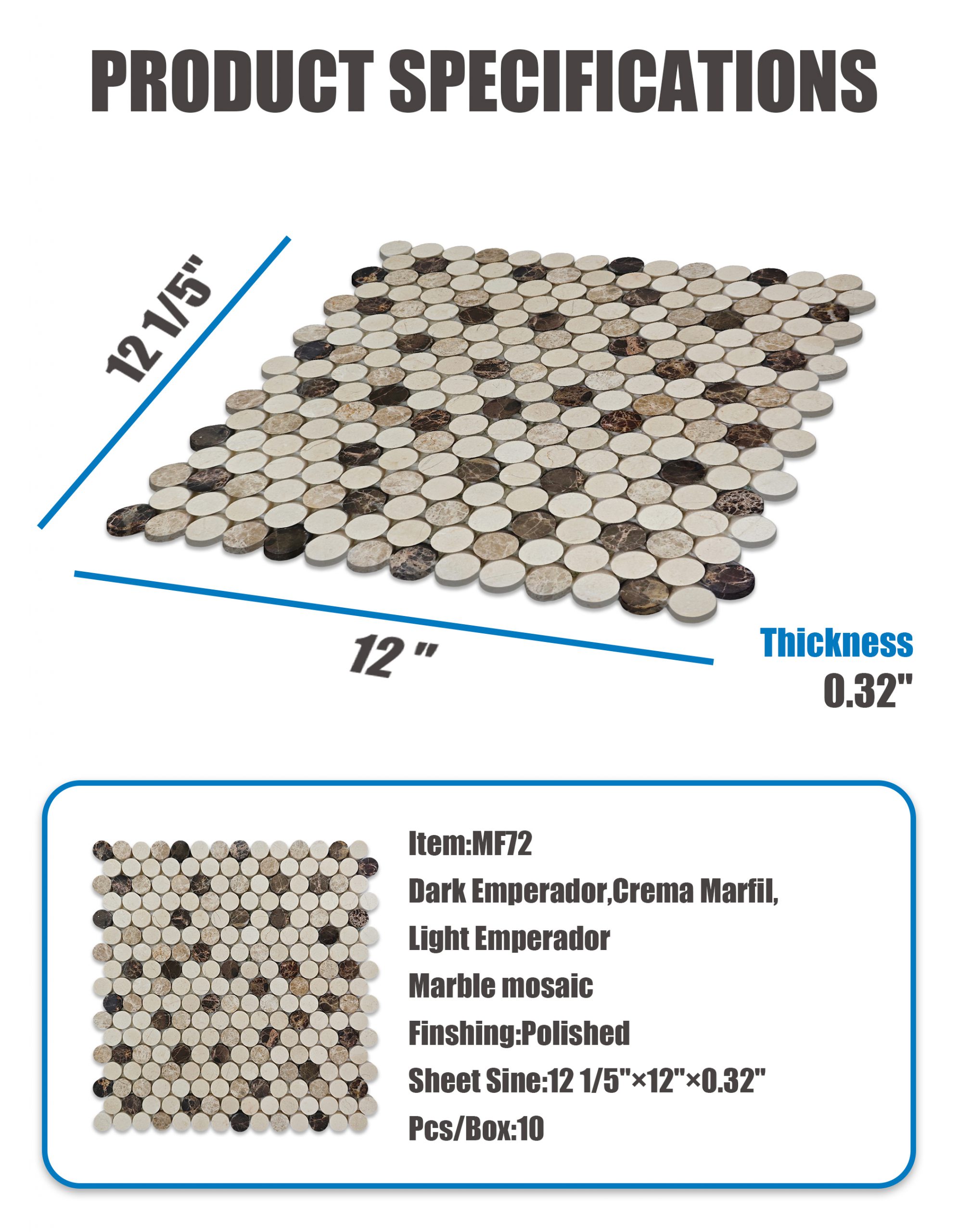 MF72​ — это полированная мраморная мозаика, сочетающая насыщенный мрамор Дарк Эмперадор (Dark Emperador), теплый Крема Марфил (Crema Marfil) и нежный Лайт Эмперадор (Light Emperador) в гармоничном монетообразном дизайне. Размер каждого листа составляет 12⅕» × 12″ × 0,32″ (приблизительно 31 × 30.5 × 0.8 см), в коробке 10 листов. Продукт предлагает готовую к укладке элегантную поверхность для фартуков, акцентных стен и декоративных зон