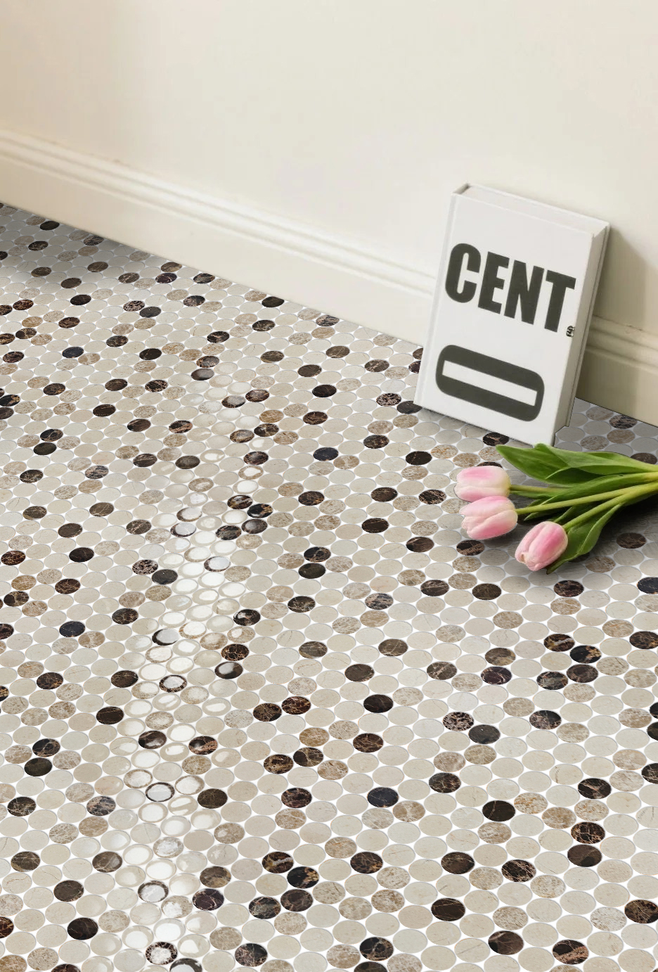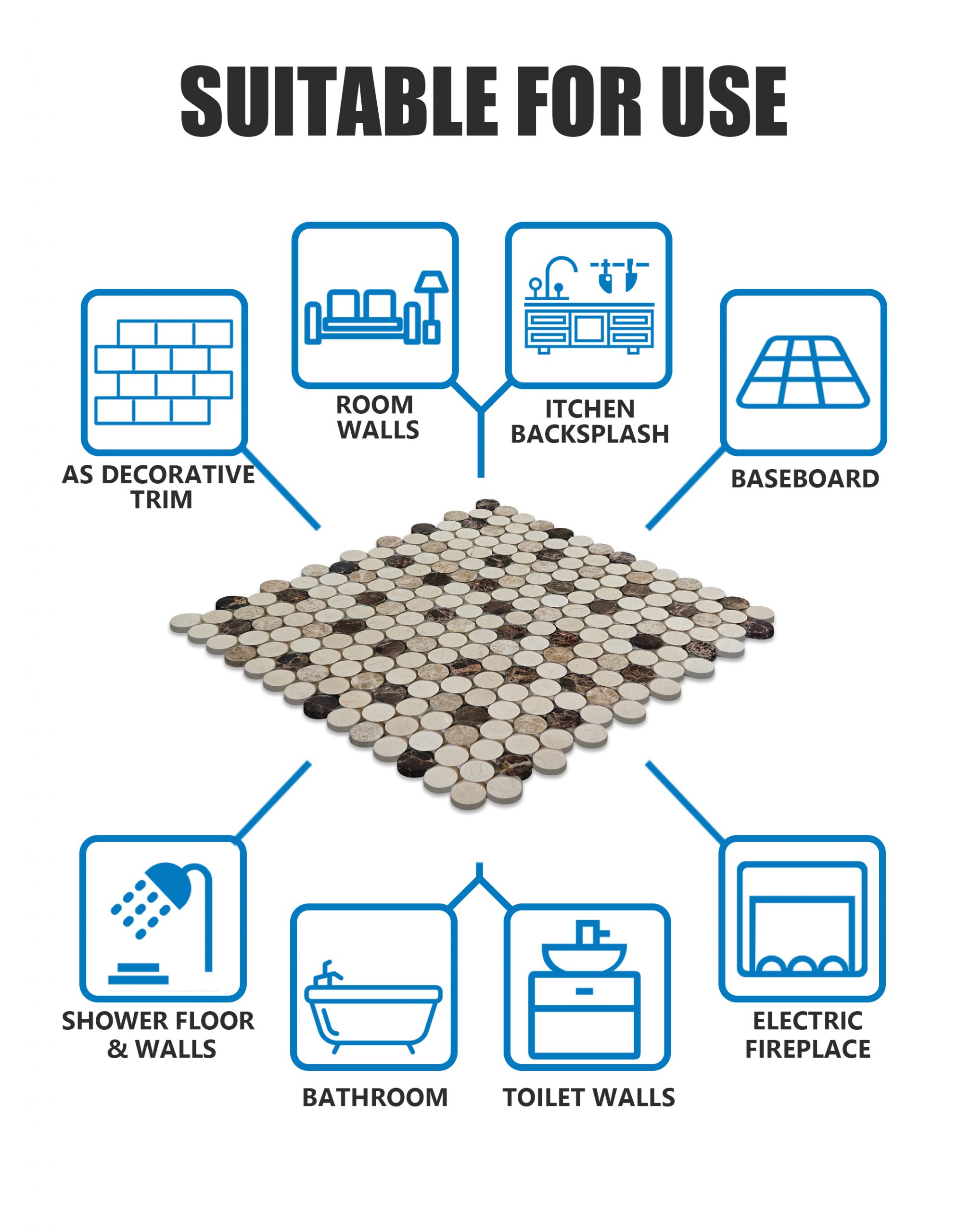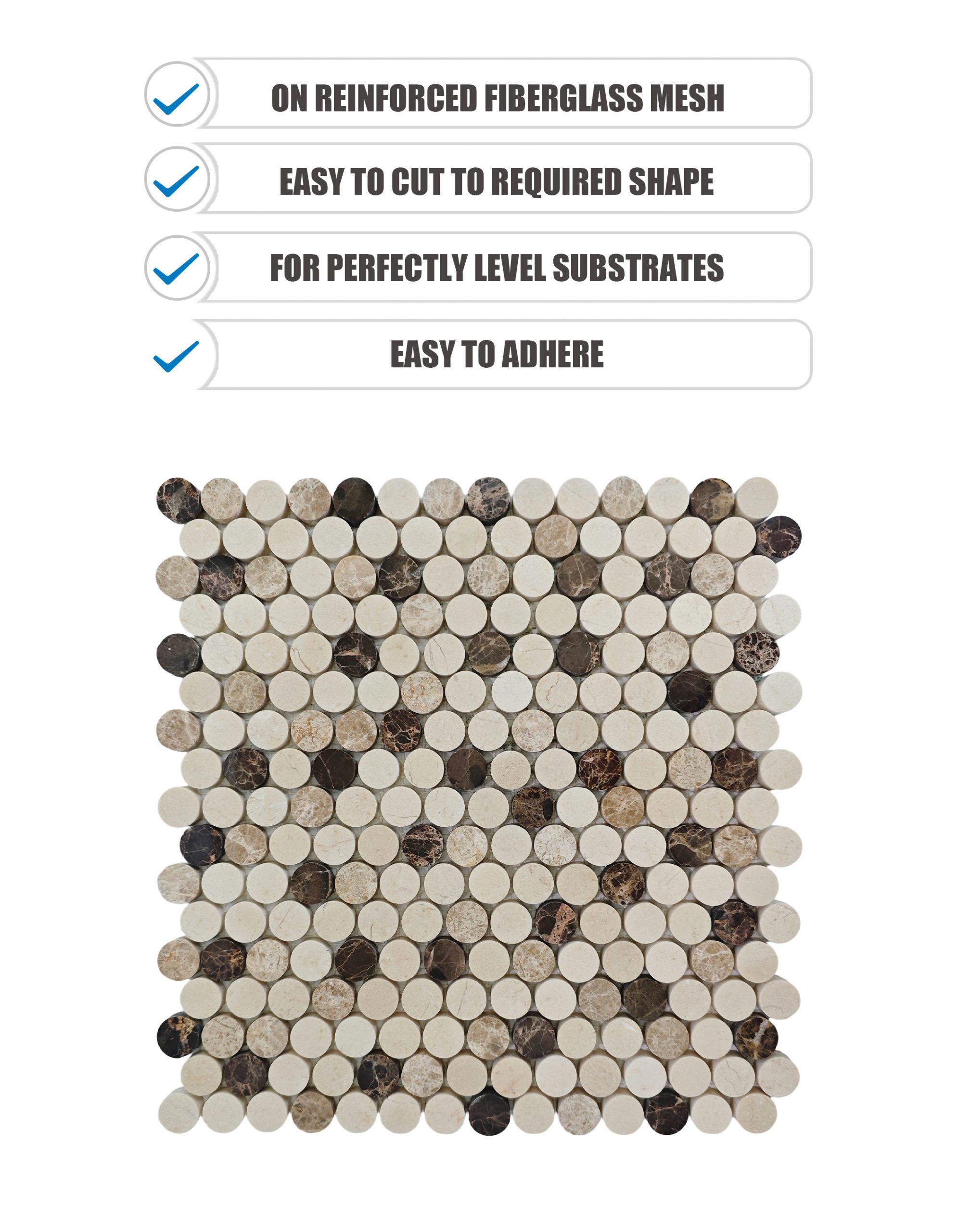 MF72​ — это полированная мраморная мозаика, сочетающая насыщенный мрамор Дарк Эмперадор (Dark Emperador), теплый Крема Марфил (Crema Marfil) и нежный Лайт Эмперадор (Light Emperador) в гармоничном монетообразном дизайне. Размер каждого листа составляет 12⅕» × 12″ × 0,32″ (приблизительно 31 × 30.5 × 0.8 см), в коробке 10 листов. Продукт предлагает готовую к укладке элегантную поверхность для фартуков, акцентных стен и декоративных зон