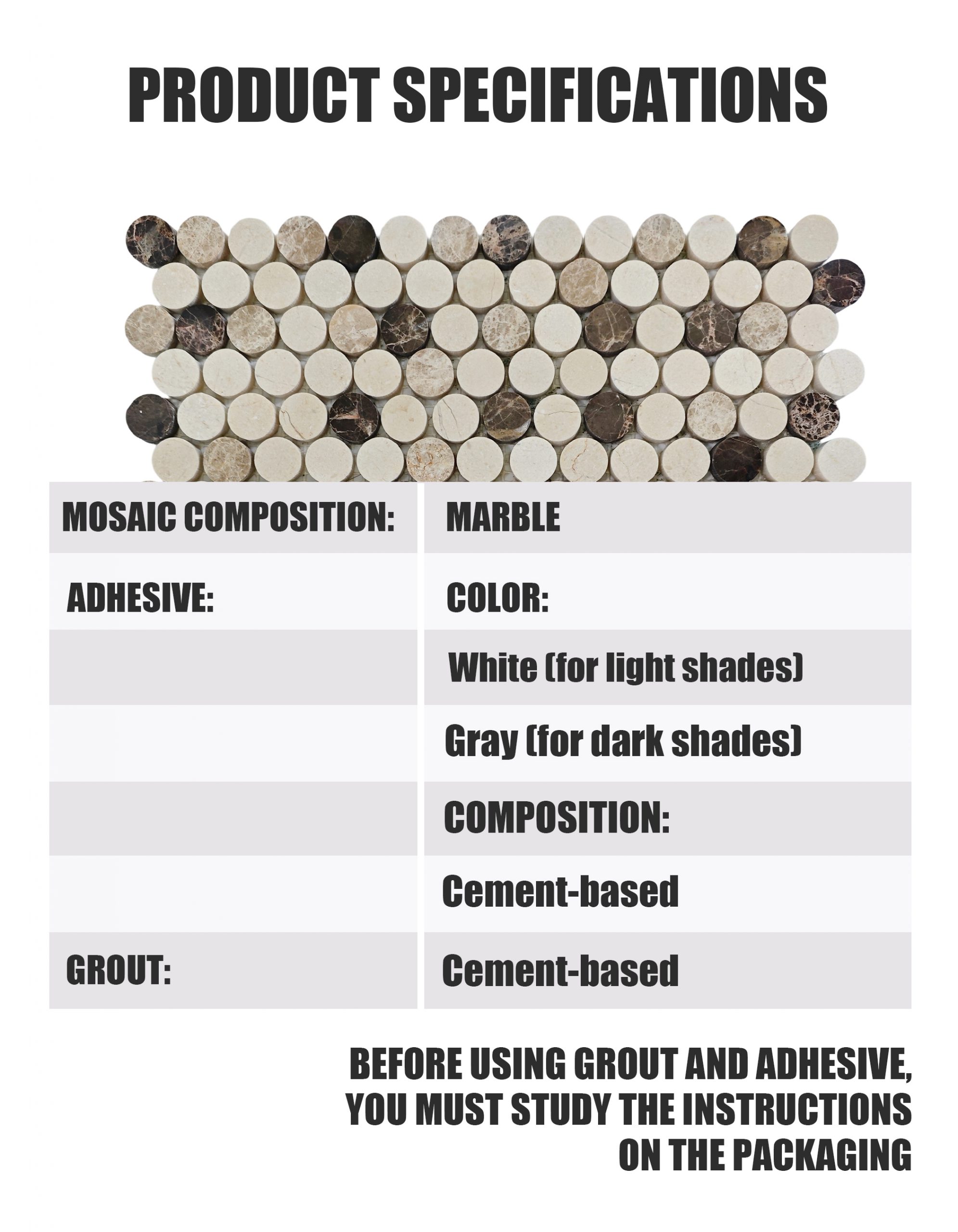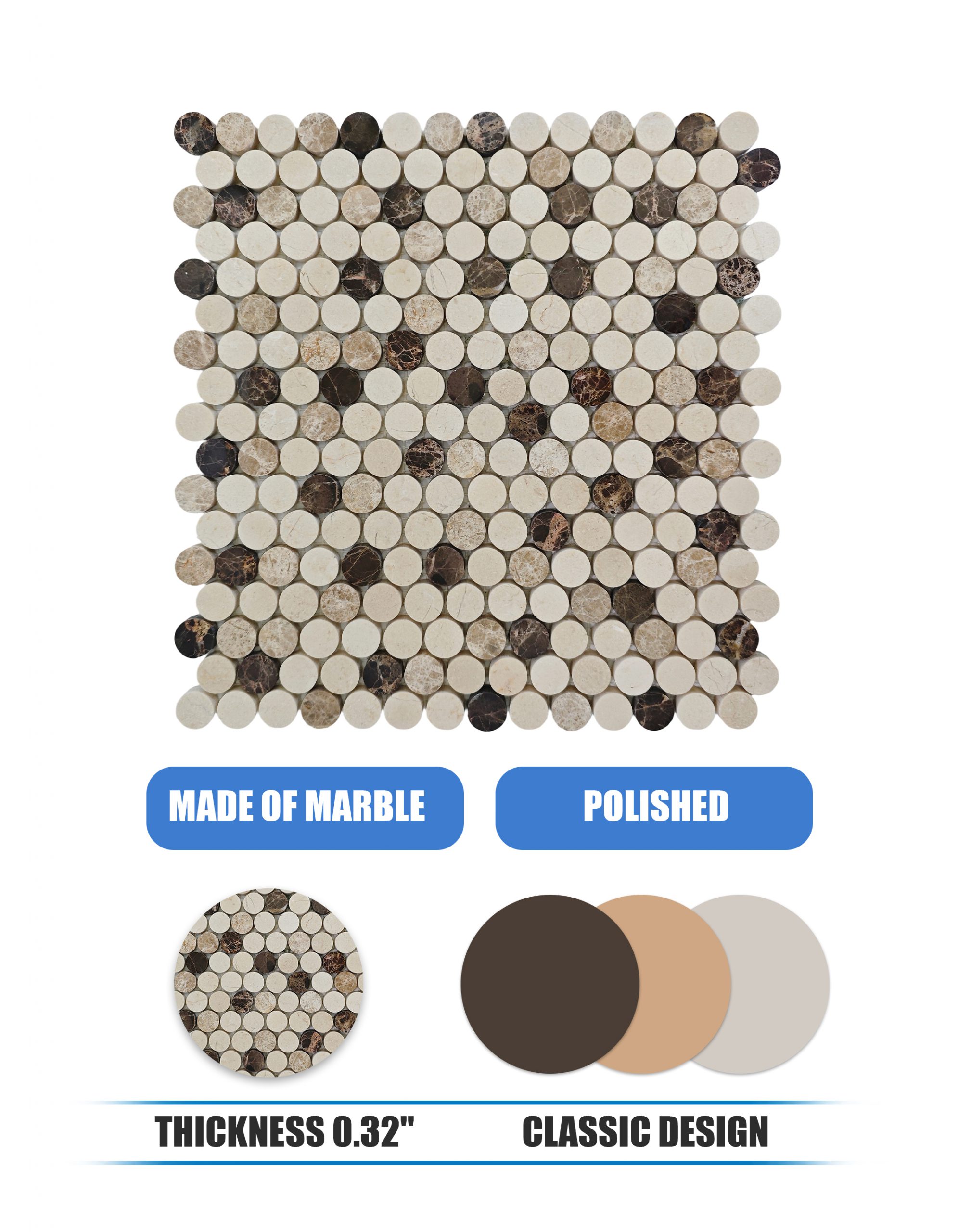 Изделие MF72 представляет собой полированную мраморную мозаику, в которой искусственно сочетаются три разновидности элегантного мрамора — Дарк Эмперадор (Dark Emperador), Крема Марфил (Crema Marfil) и Лайт Эмперадор (Light Emperador) — в единой композиции формы монеты. Теплые, природные тона мрамора создают естественную привлекательную палитру, а полированная отделка добавляет сияющий блеск, подчеркивающий глубину и текстуру камня. Эта мозаика привносит ощущение органичной изысканности в любой интерьер, дополняя как традиционные, так и современные стили оформления .