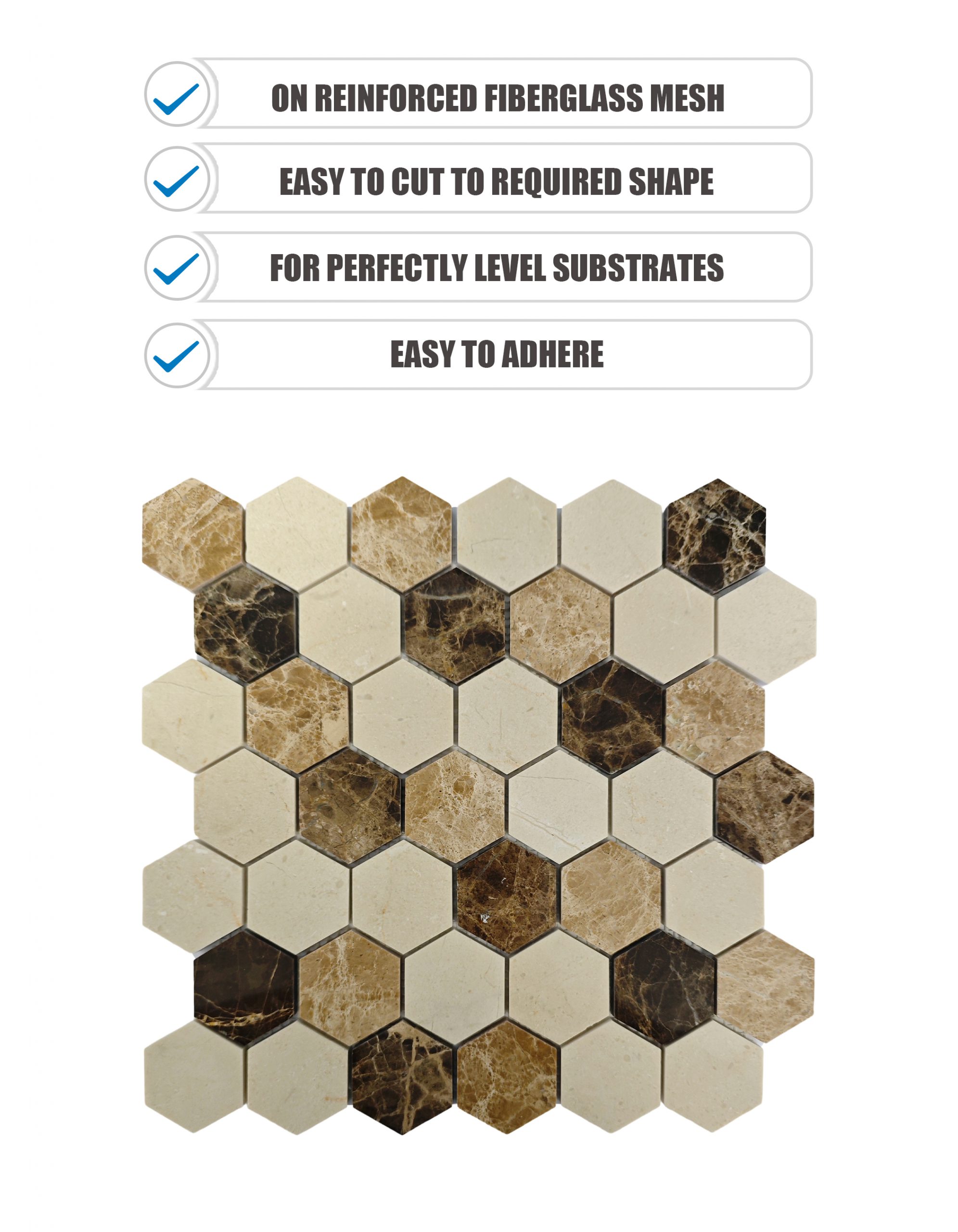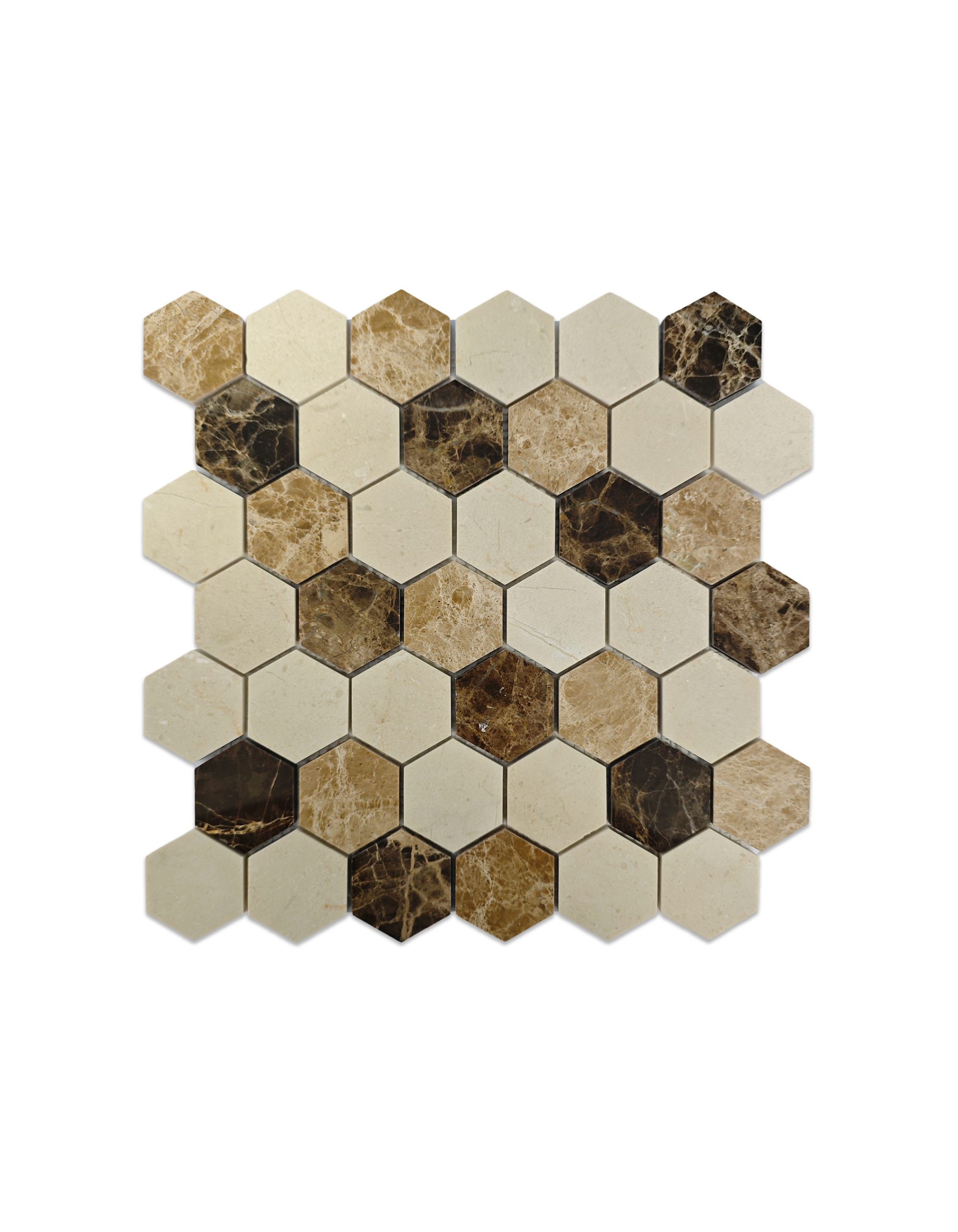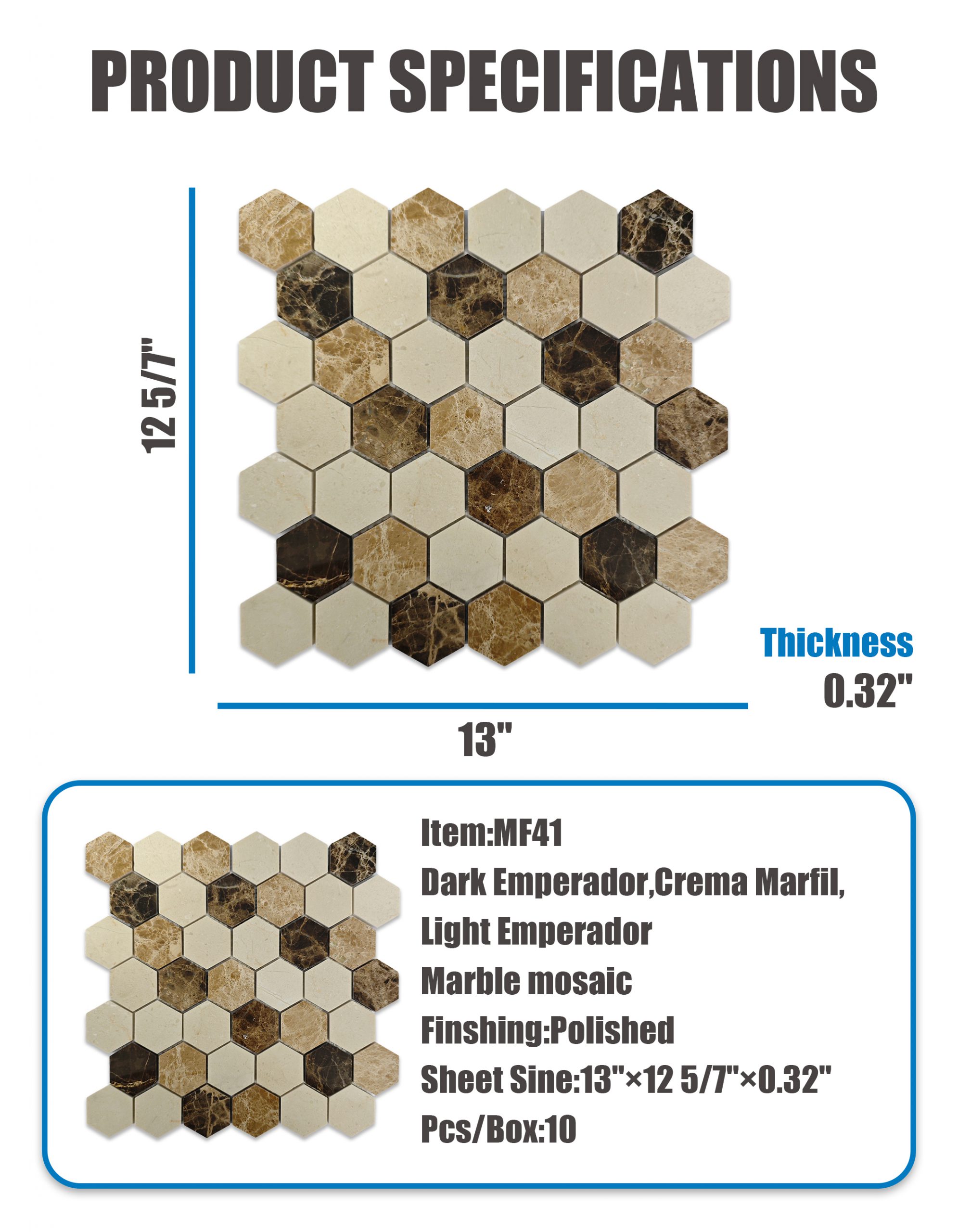 Изделие MF41 представляет собой полированную шестигранную мраморную мозаику, в которой сочетаются три разновидности натурального мрамора: Дарк Эмперадор (Dark Emperador), Крема Марфил (Crema Marfil) и Лайт Эмперадор (Light Emperador). Теплые, природные тона создают гармоничный и органичный визуальный поток, а полированная отделка подчеркивает естественную прожилку и светоотражающую способность камня. Эта мозаика привносит нотку утонченной, вневременной текстуры в кухни, ванные комнаты и акцентные стены как в жилых, так и в коммерческих помещениях.