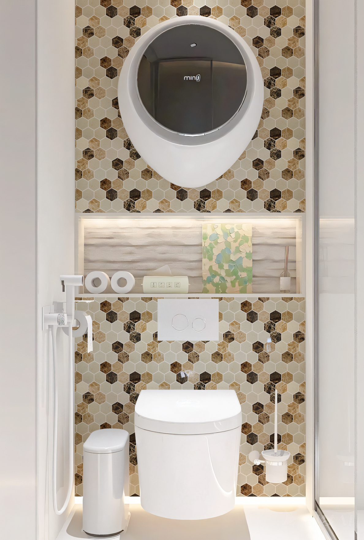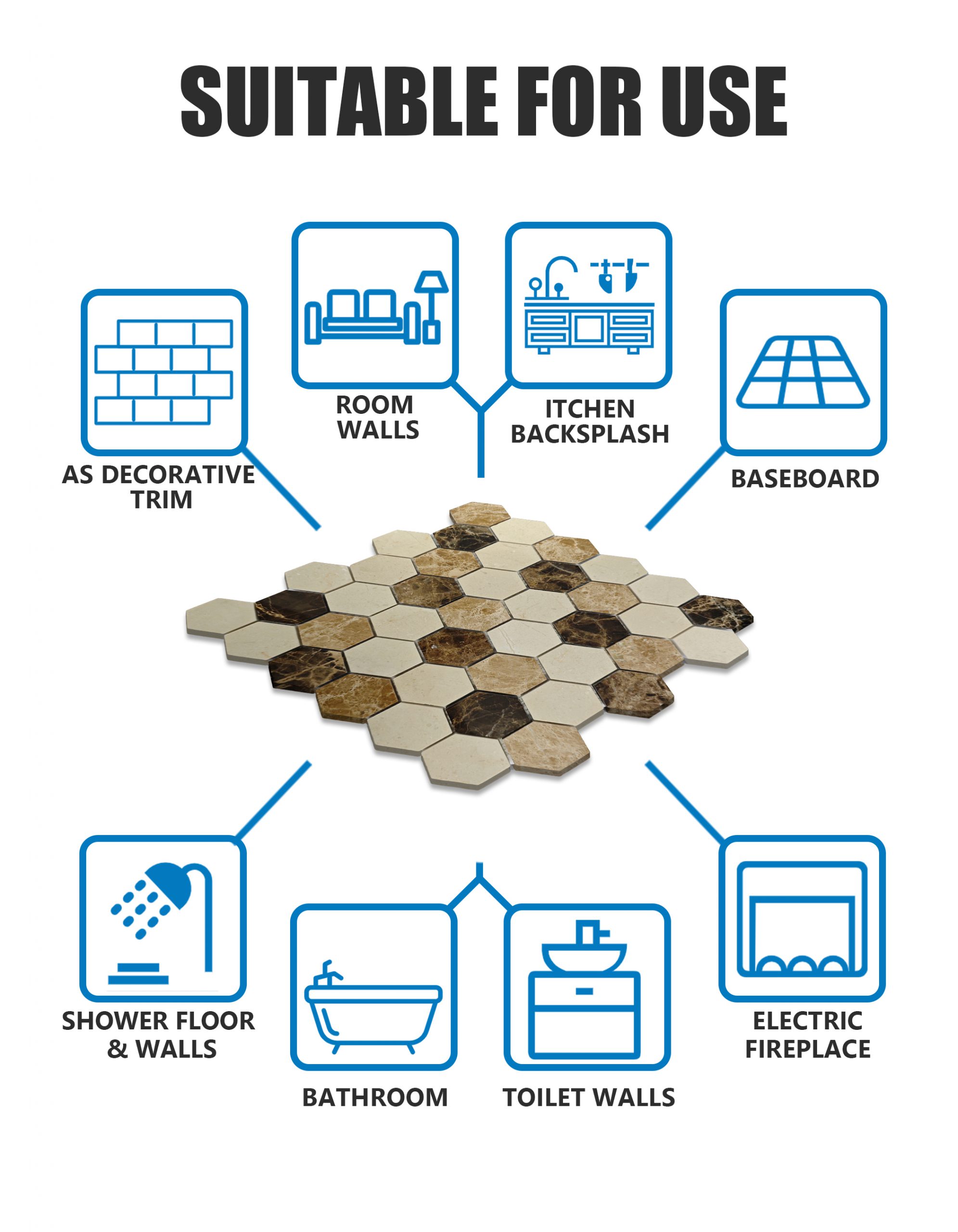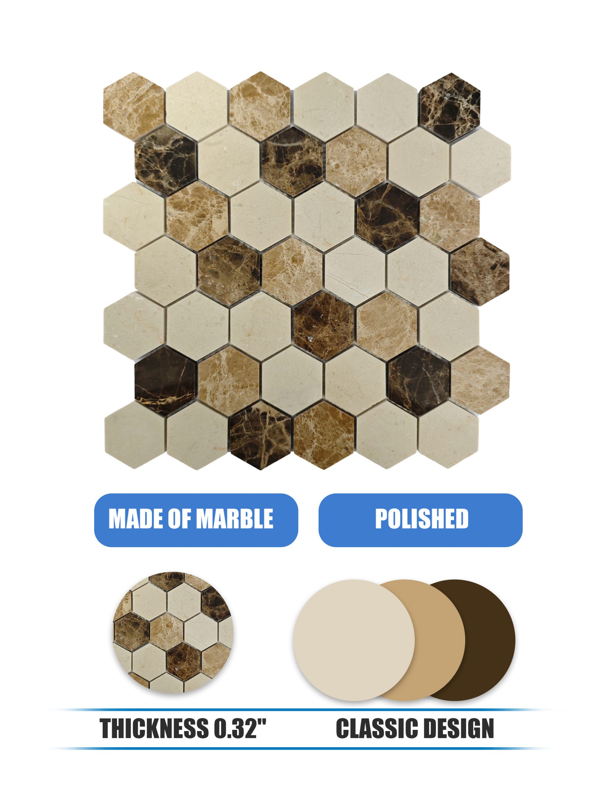 Изделие MF41 представляет собой полированную шестигранную мраморную мозаику, в которой сочетаются три разновидности натурального мрамора: Дарк Эмперадор (Dark Emperador), Крема Марфил (Crema Marfil) и Лайт Эмперадор (Light Emperador). Теплые, природные тона создают гармоничный и органичный визуальный поток, а полированная отделка подчеркивает естественную прожилку и светоотражающую способность камня. Эта мозаика привносит нотку утонченной, вневременной текстуры в кухни, ванные комнаты и акцентные стены как в жилых, так и в коммерческих помещениях.