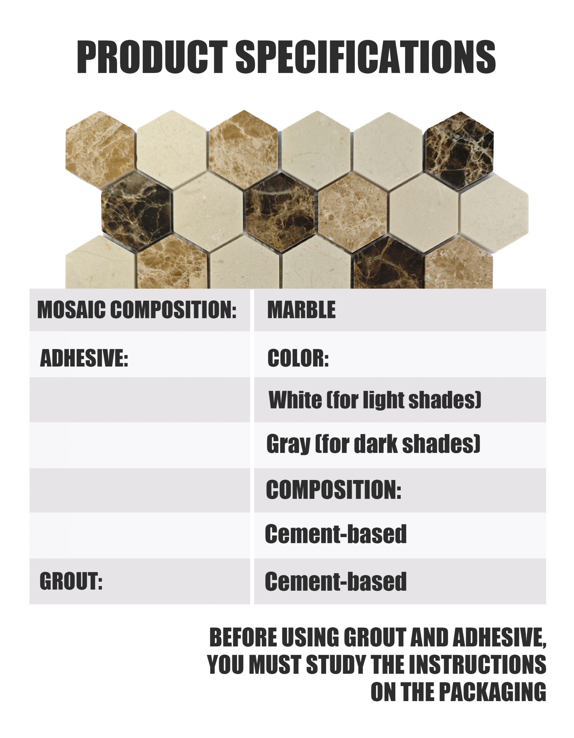 Каждая шестигранная плитка точно вырезана из натурального мрамора, что гарантирует насыщенную цветовую вариативность и долговечность. Мозаика предварительно собрана на сетчатой основе для легкой укладки с непрерывным рисунком. Полированная поверхность гладкая, отражающая и простая в уходе, что делает ее подходящей для различных видов внутренней отделки.