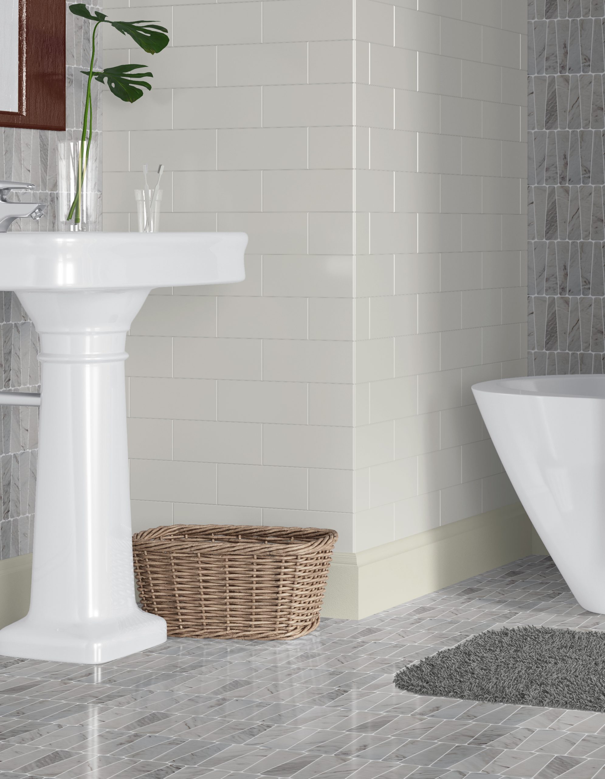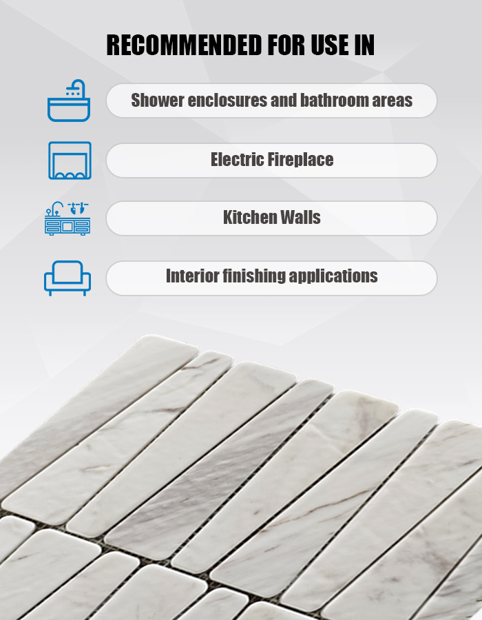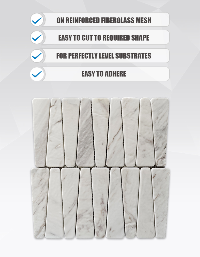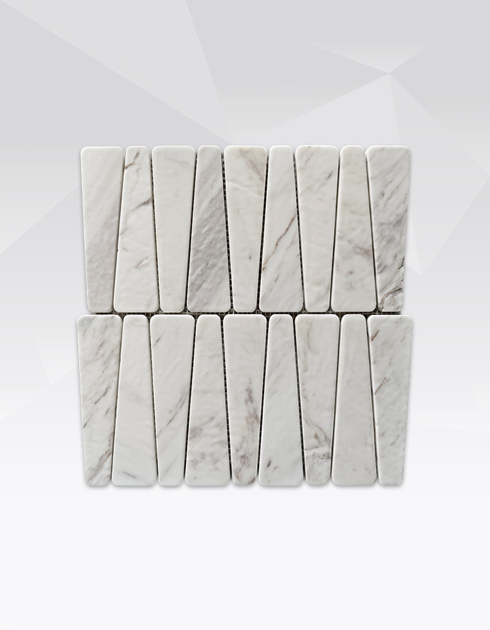 Отделка «мягкий свет» создает гладкую, матово-светящуюся поверхность, которая минимизирует блики и подчеркивает нежную серо-белую прожилку, характерную для натурального мрамора. Эта сдержанная текстура создает спокойный, тактильный фон, подходящий для современных, минималистичных и вдохновленных wellness-практиками пространств. Мозаичная раскладка организована в чистый, повторяющийся узор, который способствует визуальной текучести и позволяет творчески применять её на стенах и полу .
