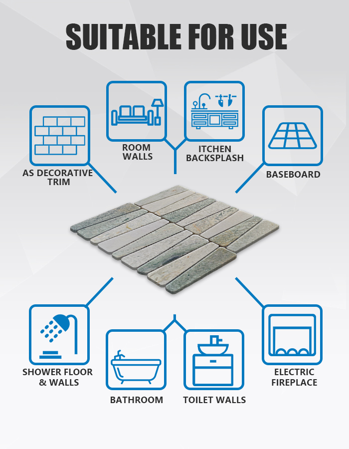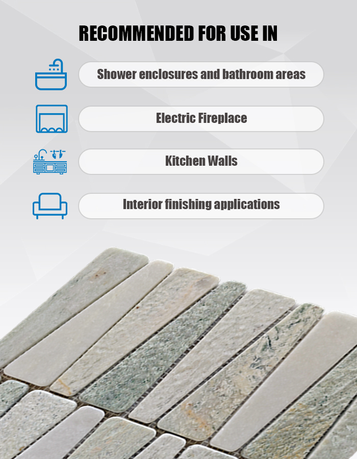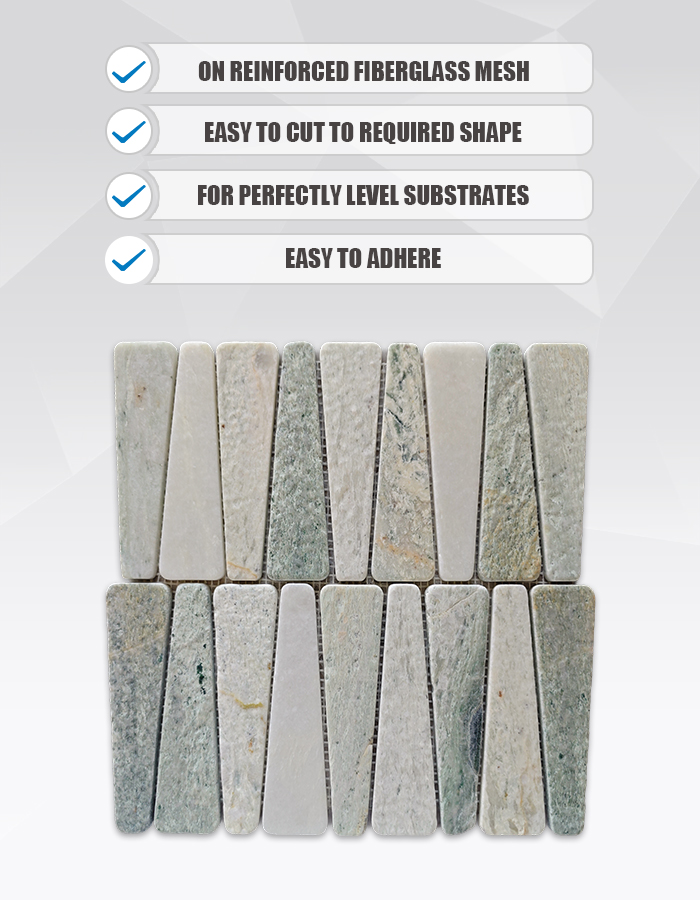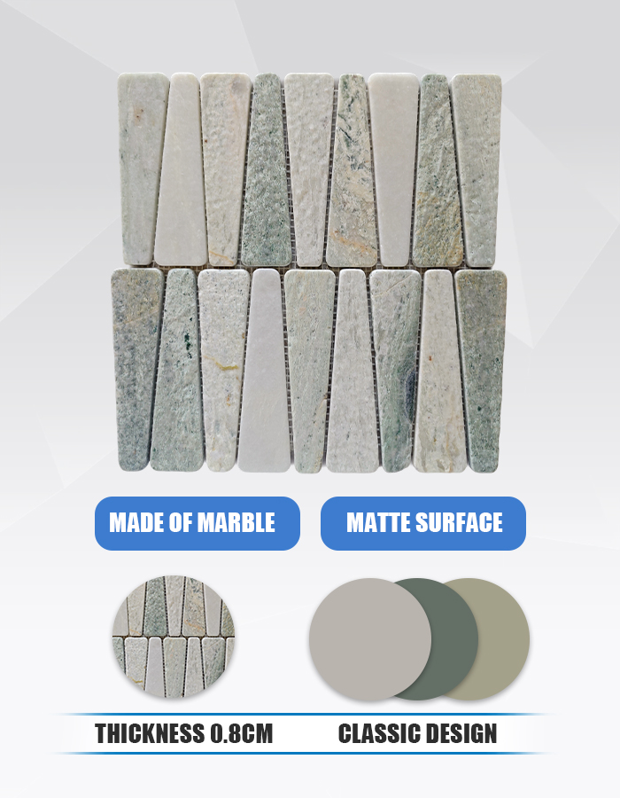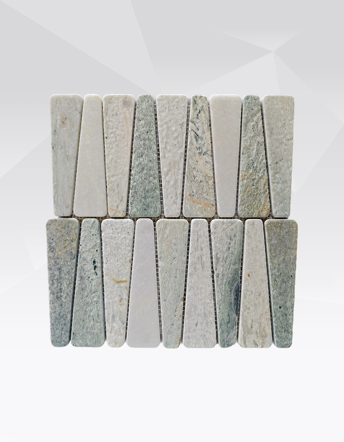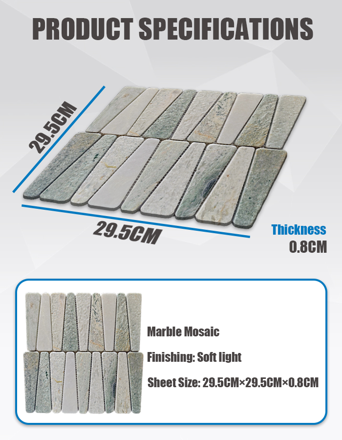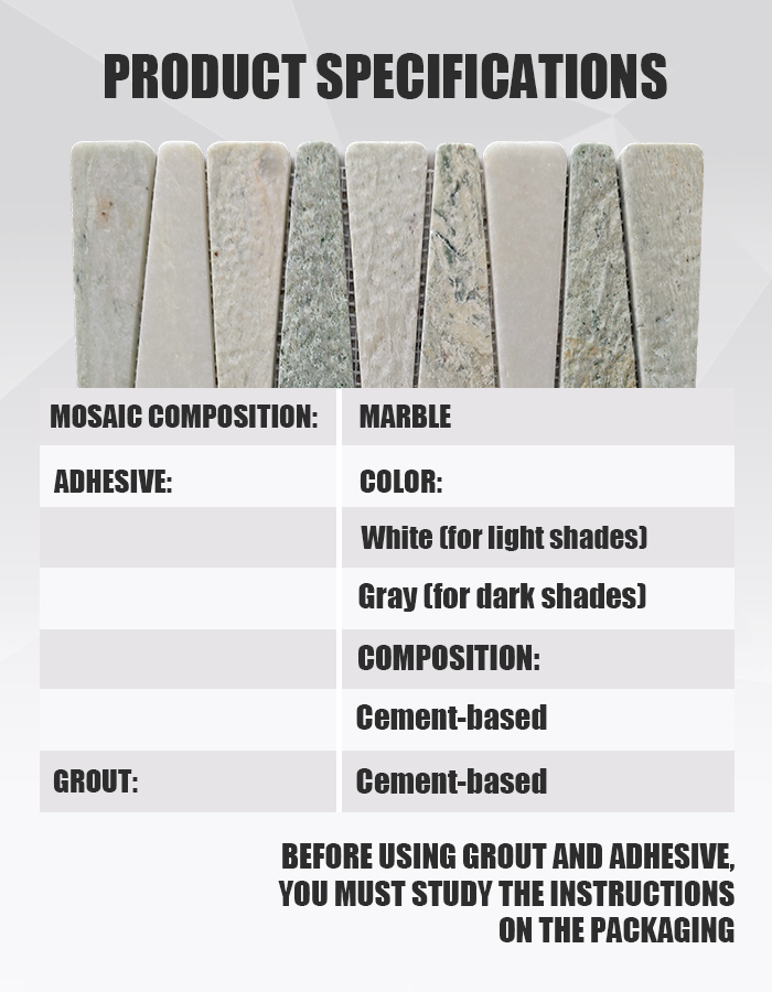 Эта мраморная мозаичная плитка разработана для пространств, требующих утонченной изысканности. Она сочетает в себе красоту натурального камня с современной отделкой «Мягкий свет». Каждый предварительно собранный лист содержит удлиненные прямоугольные плитки, расположенные в чистой линейной раскладке, что создает органичный и намеренно современный вид. Мягкая поверхность с низким блеском минимизирует блики и подчеркивает нежную серо-белую основу камня с легкими сине-зелеными прожилками, благодаря чему плитка оказывается тактильно приятной и визуально успокаивающей .