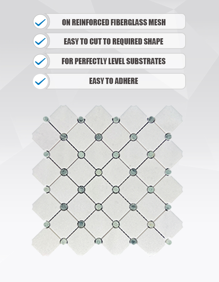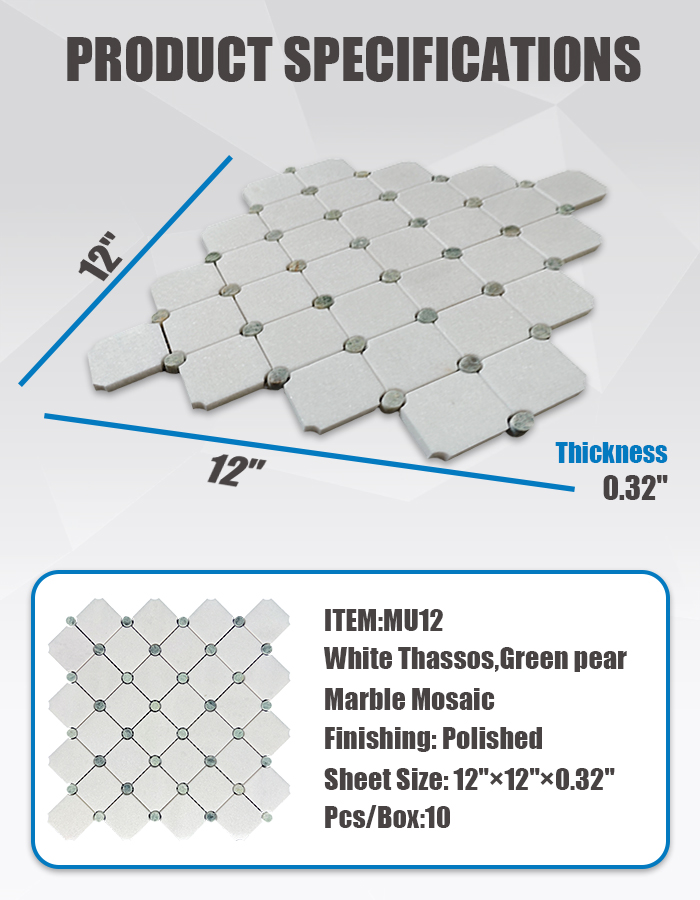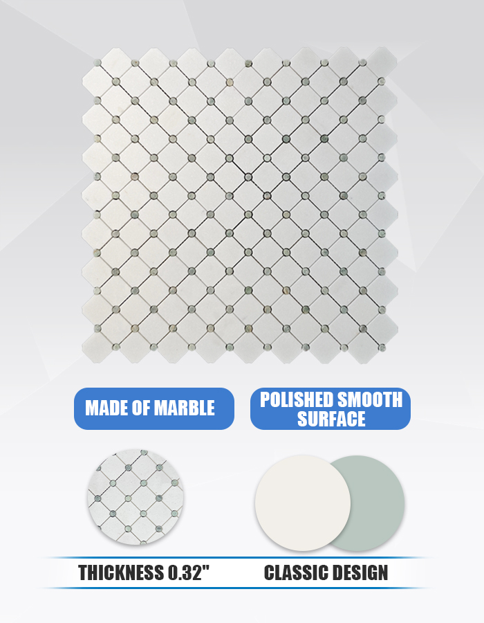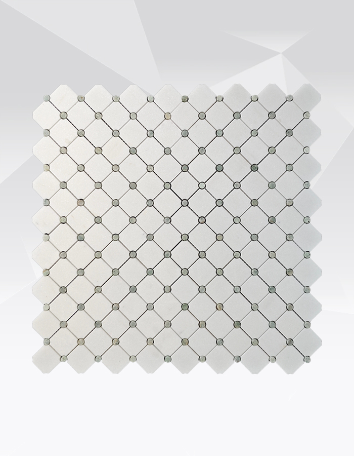 Данная мозаика (артикул MU12), созданная из натурального белого мрамора Тасос и насыщенного зелёного мрамора «Грин Пёр», представлена в утончённом ромбовидном исполнении. Квадратные плитки белого Тасоса формируют базовую сетку, а на каждом пересечении расположен небольшой скруглённый акцент из зелёного мрамора «Грин Пёр». В результате получается чистый, ритмичный узор, который ощущается одновременно структурированным и органично привлекательным – идеальное решение для привнесения нотки кураторского искусства в современные, переходные или вдохновлённые природой интерьеры .