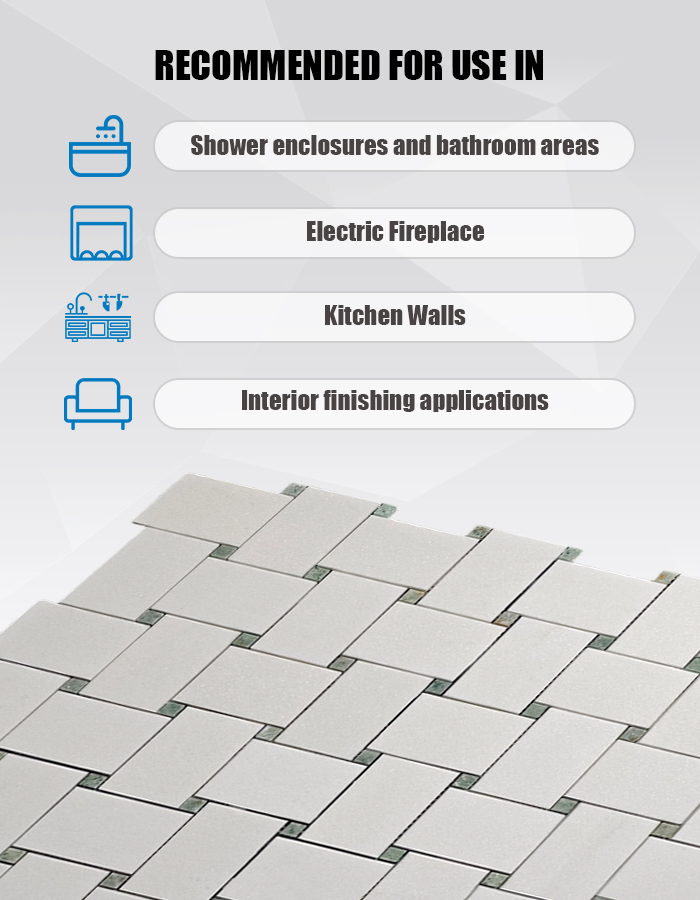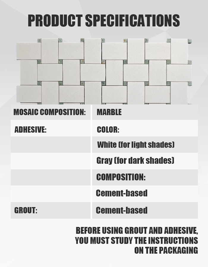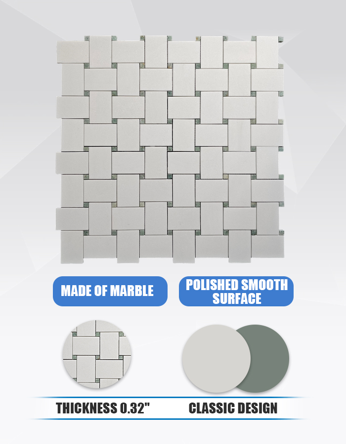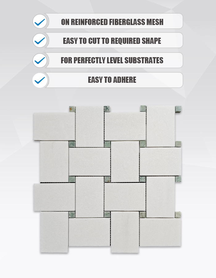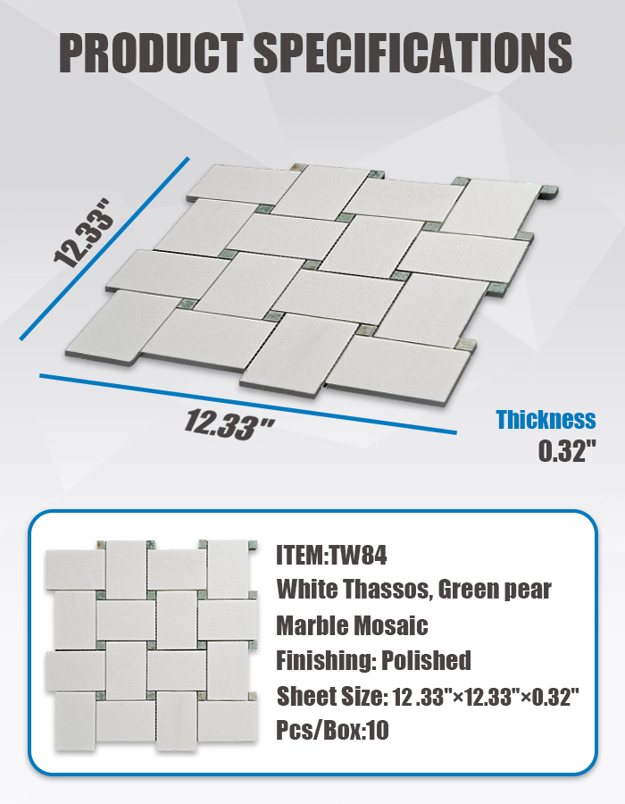 Изделие TW84 представляет собой полированную мраморную мозаику, в которой искусно сочетаются классический белый мрамор Тасос и оживленный зелёный мрамор «Грин Пёр». Дизайн в сбалансированной сетчатой раскладке привносит нотку природной свежести и утонченной детализации на кухни, в ванные комнаты и акцентные стены. Это идеальное решение для проектов, требующих чёткой, светящейся и вневременной эстетики .